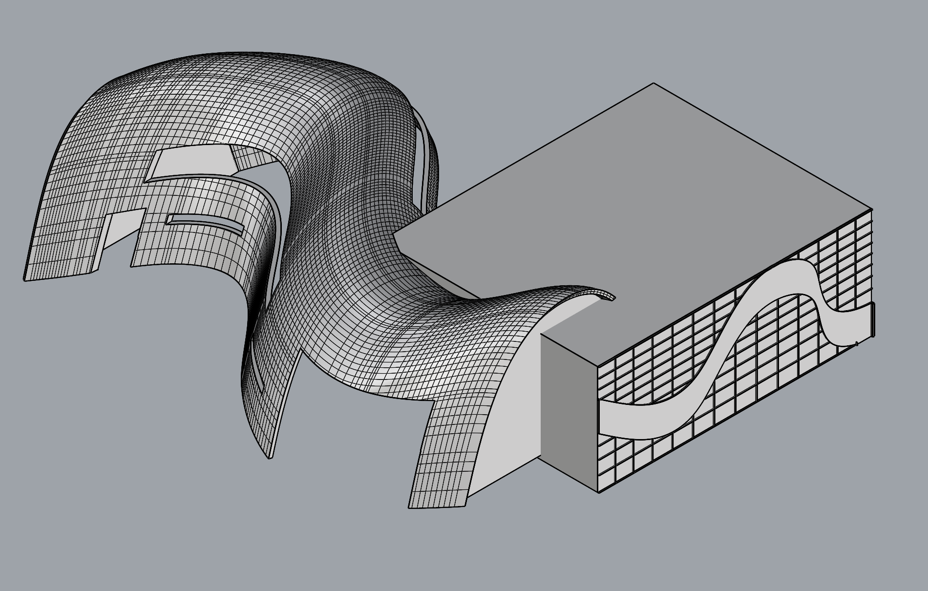 perspective shot make the open spaces int he shell glass and the right side glass with a steel grid facade maybe use some lighting the wave on the grid can be vegetation architecture