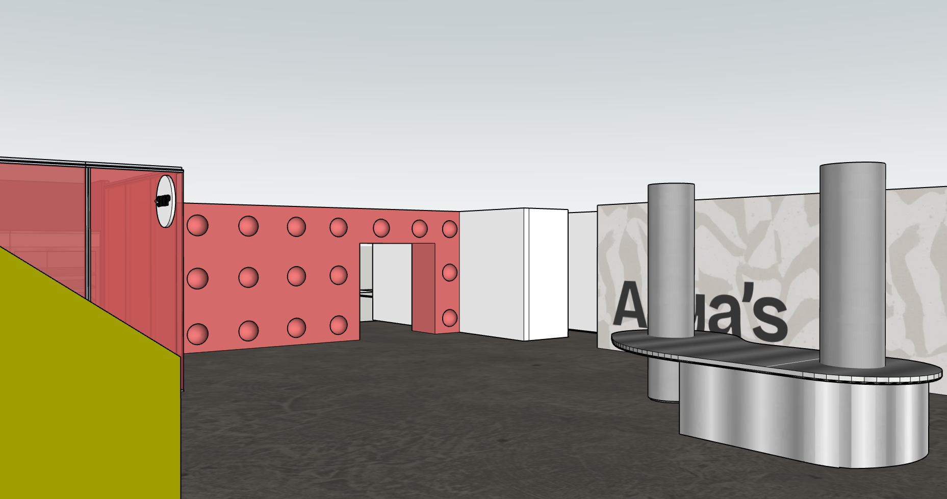 make glass on retail shop pink to match wall and staircase wall green like in original image keep all else the same