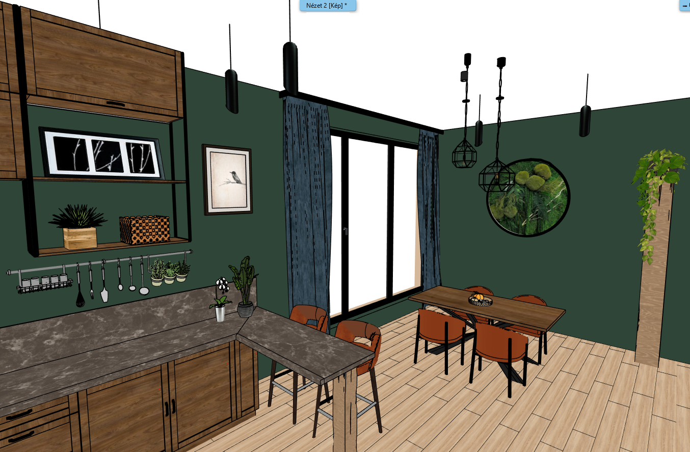 create a soft loft atmosphere the wall is dark green ral6005 the parquet is medium oak add a nice texture to it the dining chair and bar stools are also terracotta there are black metal framed lamps above the dining table with a light bulb in the middle that gives off a pleasant glow behind the dining table there is a green plant decoration in a black circular frame on the wall a green leafy plant runs down from the rustic wooden column the curtains are dark blue a little shiny we can see a big city through the windows the kitchen is walnut brown with a grayish brown marble countertop led strips light up the bottom of the shelves the spot lights brighten the wall nicely the picture is soft bright cozy light also comes from the right because there is a window there but don t show it show everything where it is in the picture