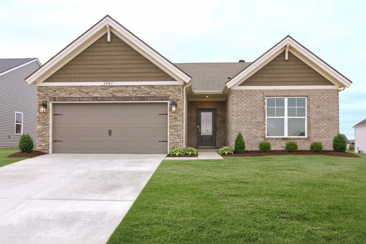 create a christmas scene complete with falling snow and lights adorning the home do not change the landscaping or the architecture of the home