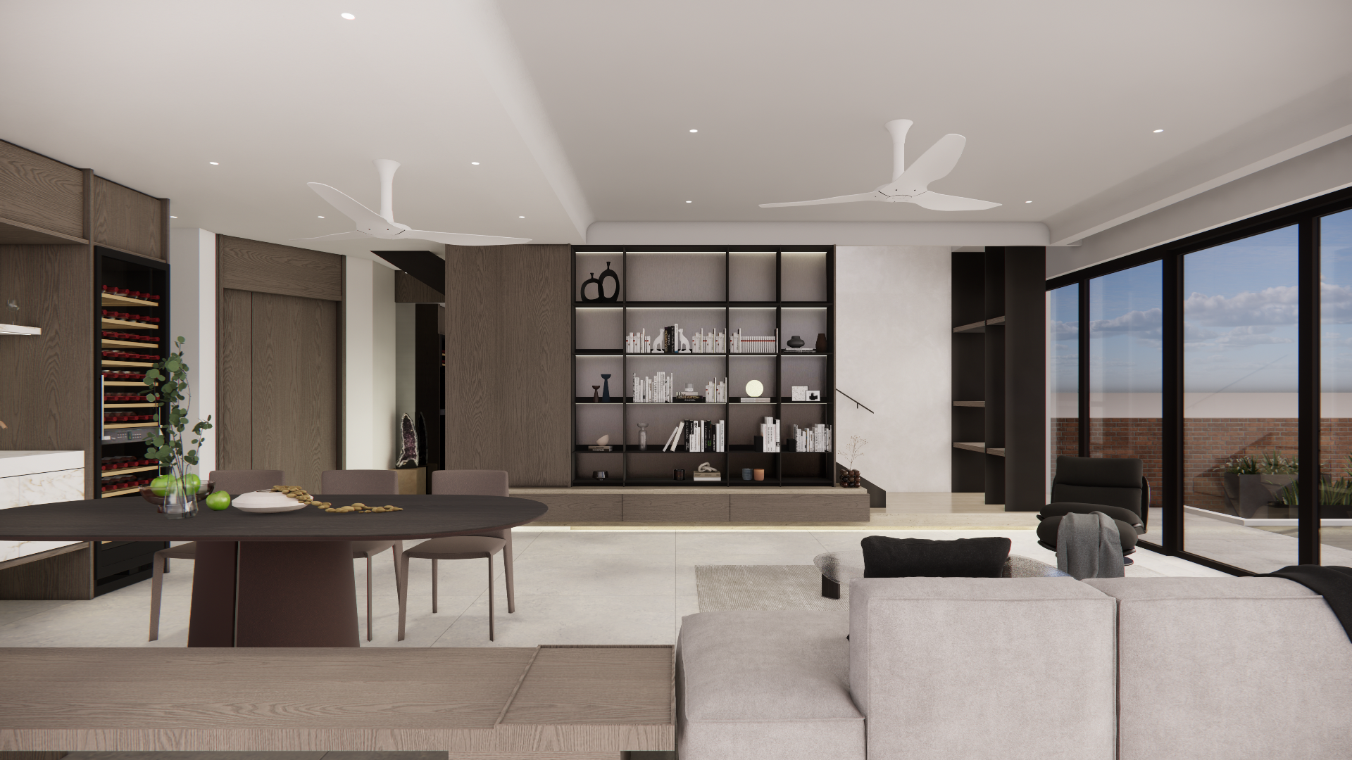 match the exact viewpoint and keep the design unchanged no modifications to furniture forms fa ade openings or layout preserve original color temperature and tone exactly upgrade realism only physically correct lighting clean indirect bounce realistic shadow softness improved material depth wood grain paint texture metal roughness accurate glass transparency and reflections subtle ambient occlusion natural highlights realistic surface imperfections very subtle keep everything architecturally consistent and professional like a studio renderer finish