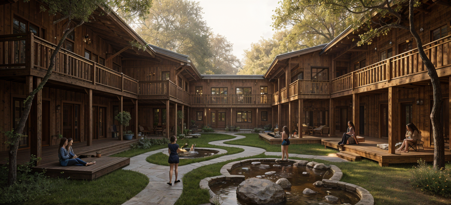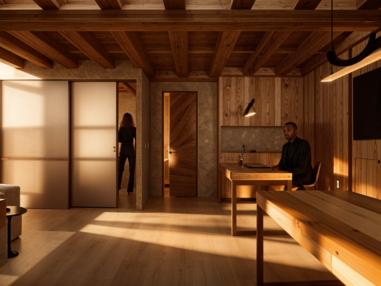 contemporary exterior shot a contemporary upper plaza located at el pueblo de los ngeles the plaza sits between classrooms and workshop spaces forming a shared terrace for learning and gathering the design emphasizes openness light and connection between levels the center of the plaza features a glass skylight floor that visually connects to the space below allowing daylight to filter through surrounding areas include planters with greenery wood and terracotta surfaces and open seating edges for informal gathering render as a calm warm afternoon scene showing people interacting walking and studying highlight the lightness of the architecture soft shadows reflections on glass and a sense of breathing space focus on transparency and texture bamboo screens tiled flooring plaster walls and light bouncing through the skylight the atmosphere feels peaceful yet lively expressing the rhythm of community and openness architecture