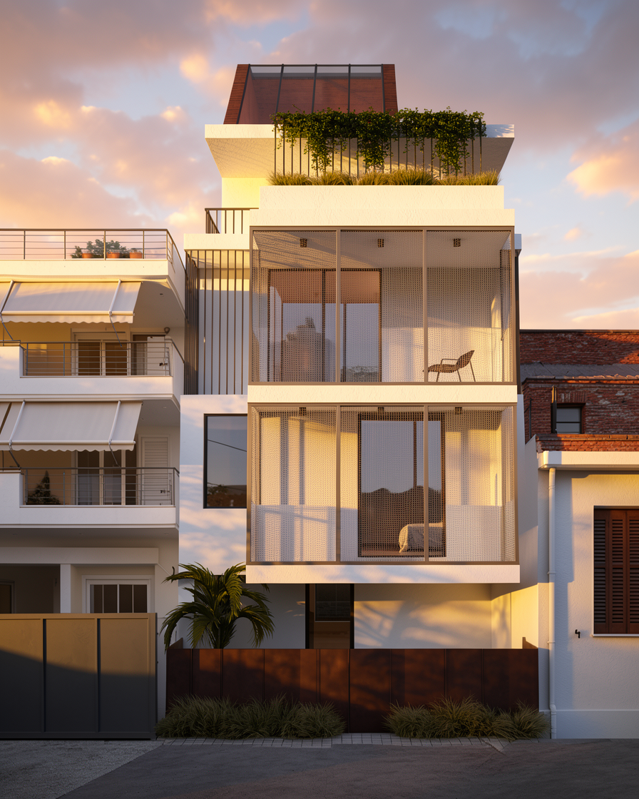 add realism to this image and as for materials in the facade the concrete surface is all the same white solid color not rough its matte and in front of the windows dark color grey close to black metallic frame holding a thin metal grating grill panel give a view in a warm sunset hour serene atmosphere like a japanese sky not many clouds more warm