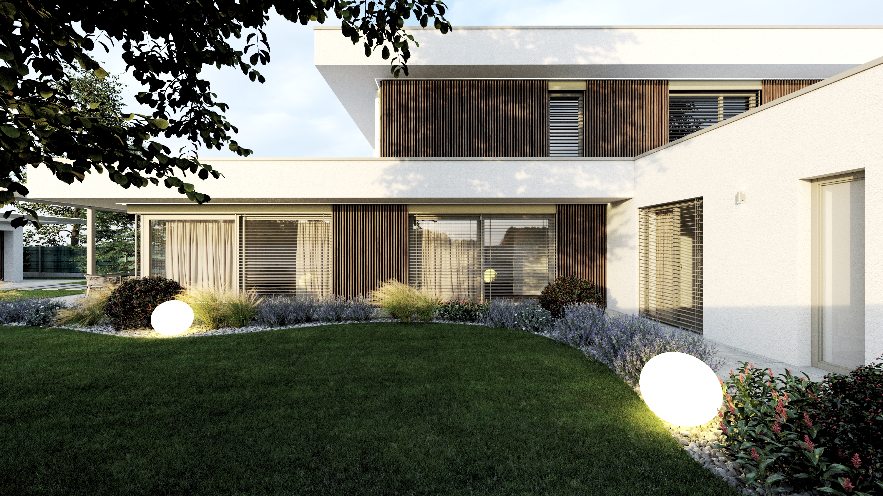 modern minimalist house with a sleek white facade large wood windows with grey outdoor blinds the foreground features a lush vibrant green lawn bordered by a variety of colorful plants enrich the atmosphere with blooming pink hydrangeas and soft purple flowers include elegant outdoor furniture on the porch in muted grey tones create a serene ambiance with a clouded sky and a backdrop of distant trees in soft green hues in backgound erase house and coloumn and insert a few trees make the scen more realistic like a photo