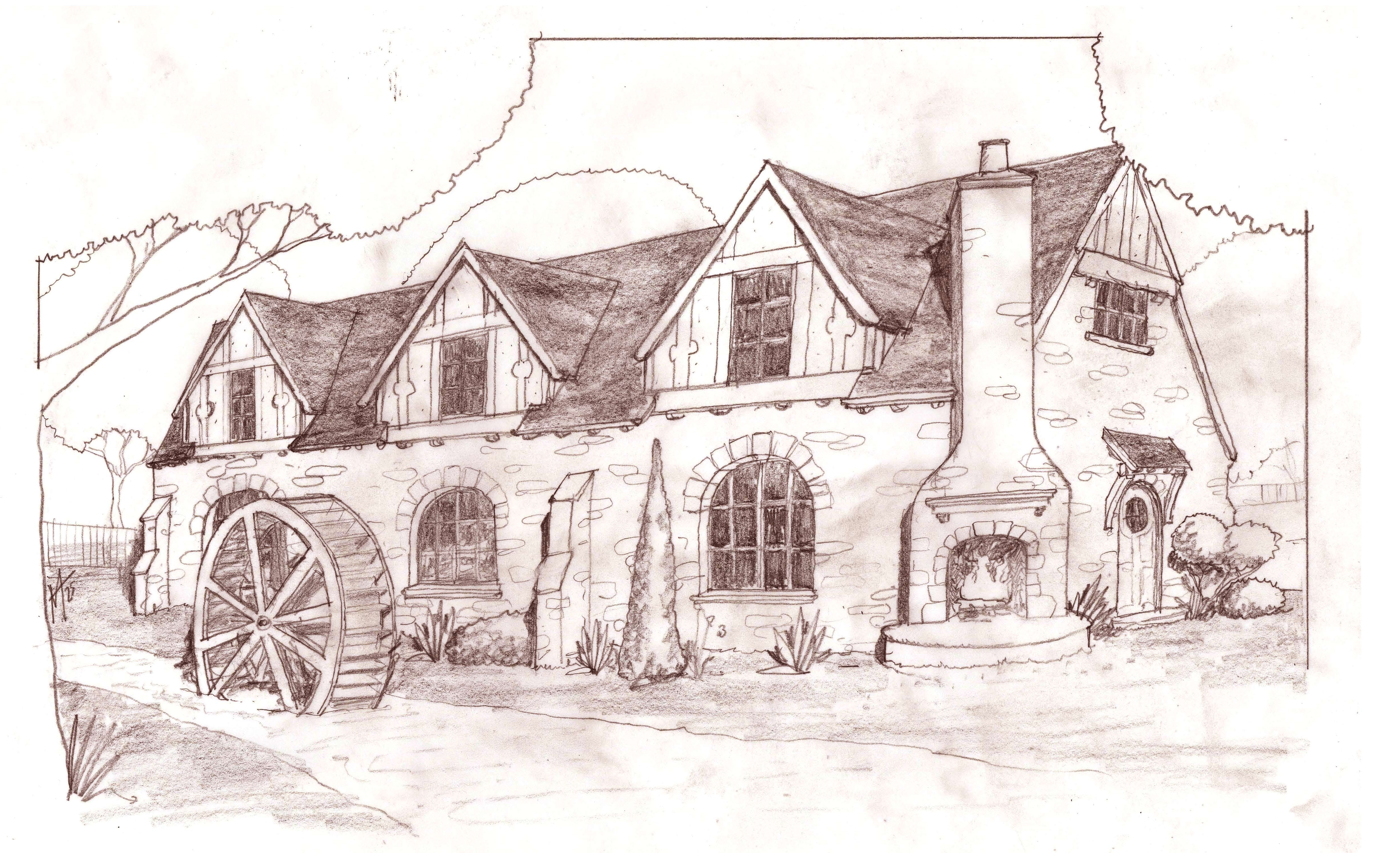 cotswold style building with outdoor fireplace wall butresses creek and water wheel