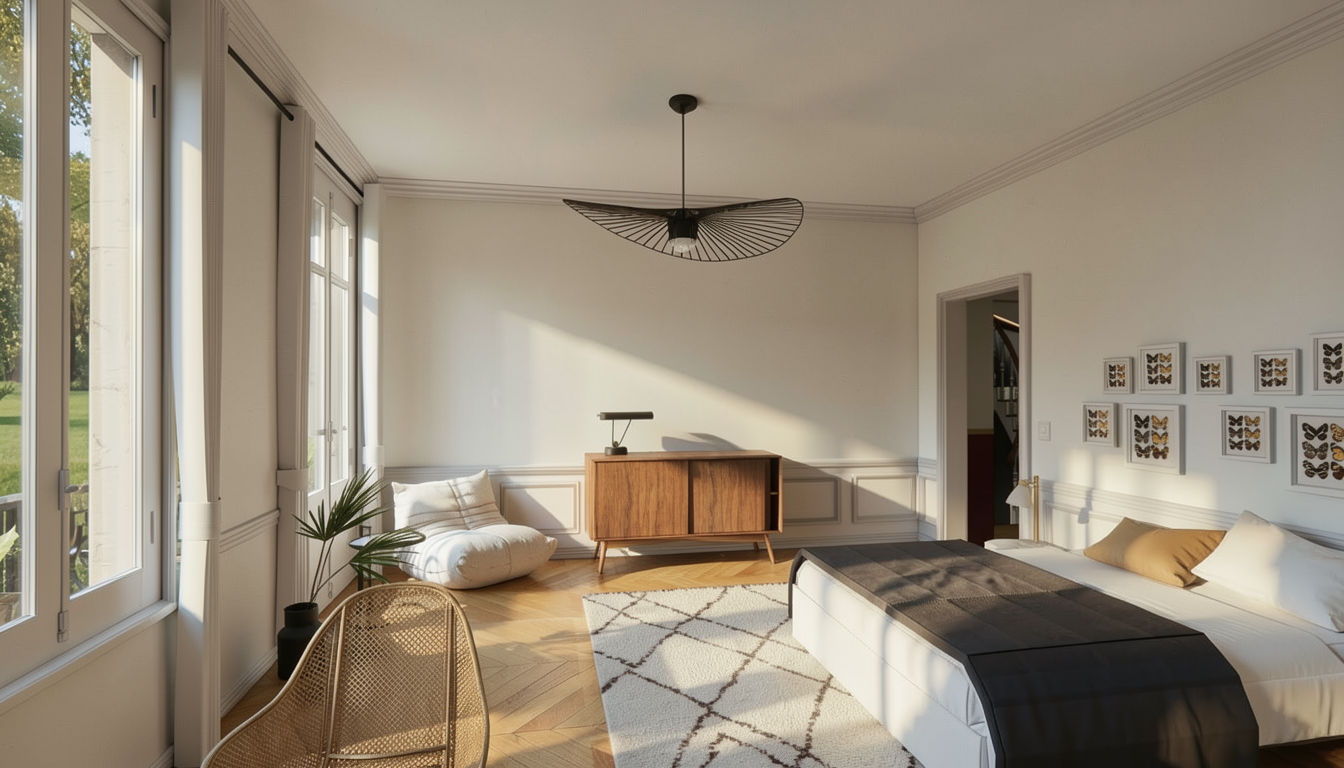 create of a photorealistic render of this space with a new mint and neon pink red colour scheme this is a professional environment with some drinks display do not include people make the view out the window fields