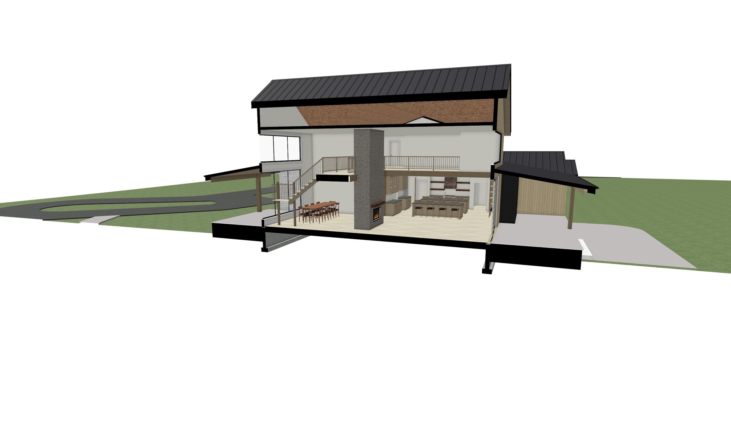 this is a 3d cross section enhance the realism of the existing architectural design while maintaining the same materials and textures focus on realistic lighting shadows and surface details to create a lifelike appearance ensure the mixture of wood siding is preserved in the correct areas making them look authentic and cohesive this is in montana add montana landscape with nice landscaping near the house add montana vegetation around the house make wood siding modern vertical 10 wider plank siding natural cedar light warm honey tone clear matte finish clean sharp edges minimal knots contemporary scandinavian farmhouse style high end residential exterior the siding is not board and batten it is wide planks with realistic wood grain texture make the wood siding planks the same width as the image reference do not add a chimney add mountains far off in the distance do nice landscaping in front of house and and native montana vegetation in forground dont add chimney nice yard in foreground remember the wood siding should be clear with no knots rock siding should be white stacked keep black siding the same trees far off to the right and mountains far off to the left