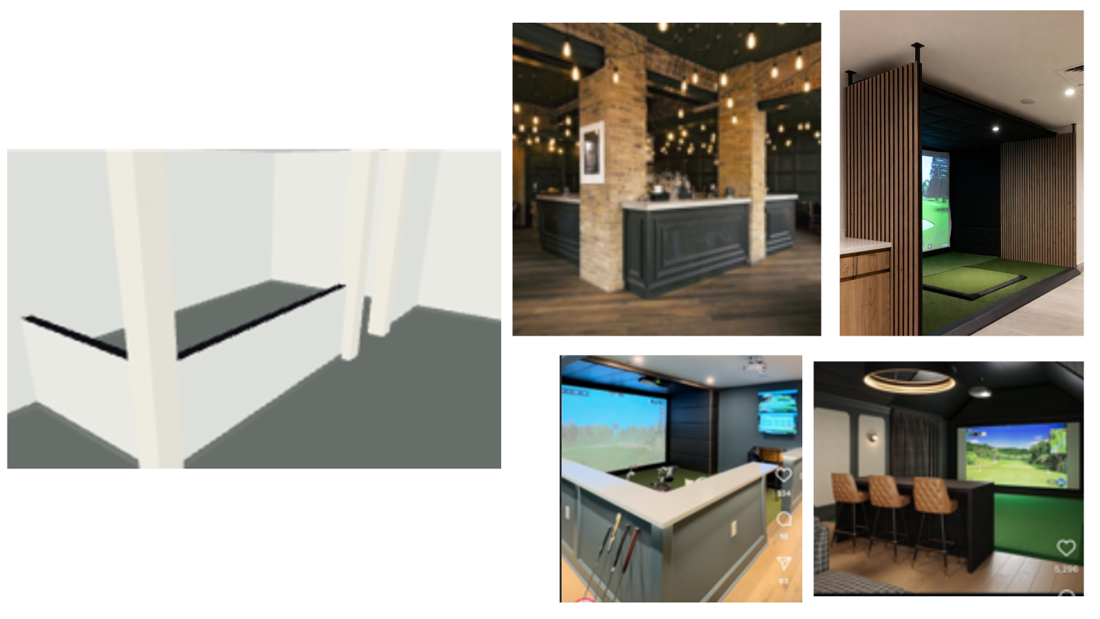 please use the image on the left side of the moodboard to create a space for a golf simulator inside the walls that are drawn please create a corner bar with a countertop and stools like the image in the bottom right of the mood board i would like the posts to be built wider and wrapped with brick like the top center image of the moodboard the right side wall of the entry to the simulator area should be the wood slat panel that is shown in the top right image of the mooodbaord