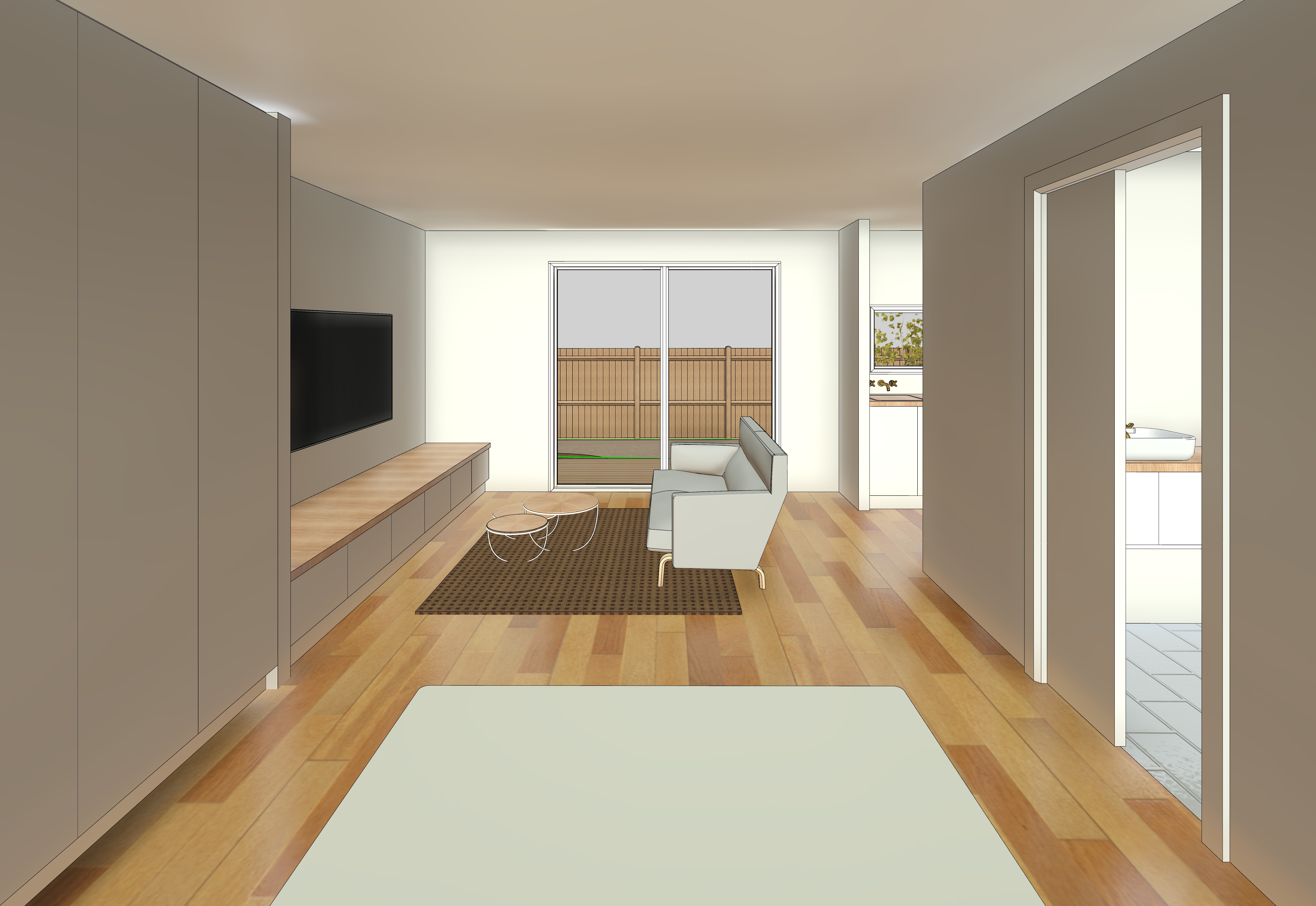 small studio tv on left wall small kitchenette on right side and sliding door slightly open with vie into ensuite large white frame glass window at end with view onto driveway and trees make the scene daytime with warmth keep joinery white with timber benchtops