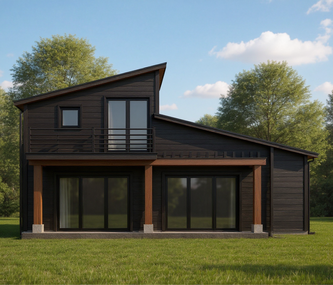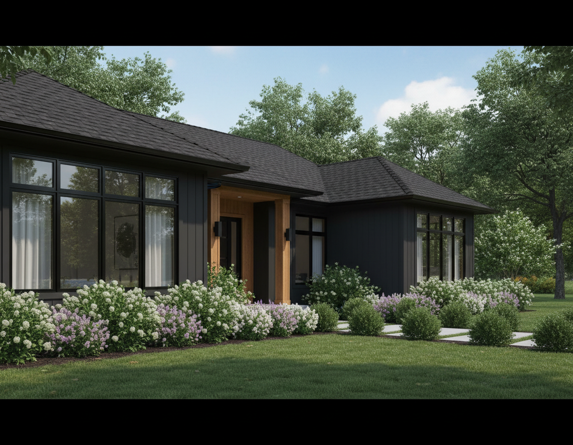 barndominium style lawns native planting sunset white board and batten claddingm black window frames