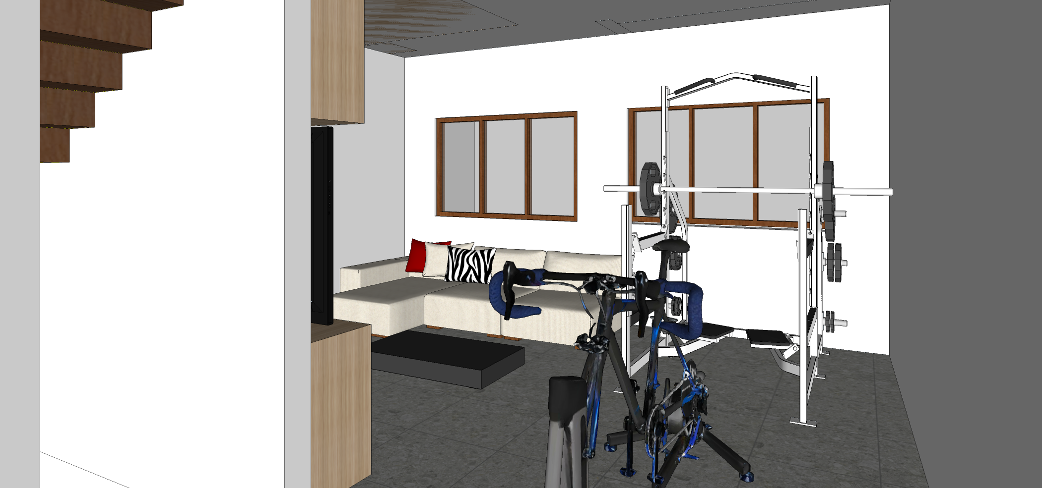 create photorealistic render of this living area maintain colors as much as possible provide warm ambient light and natural light from the windows wood is walnut color and tiles is 60x60 gray concrete tiles