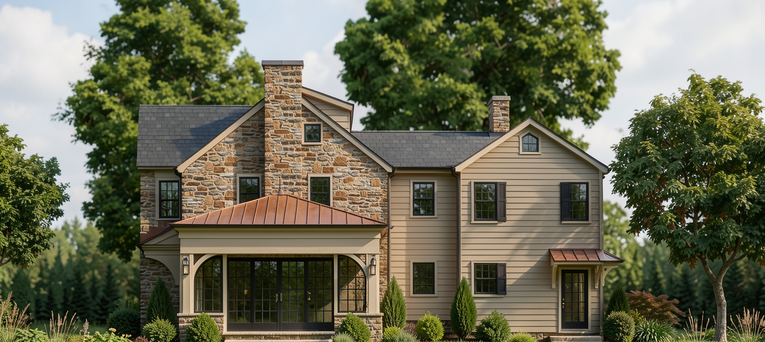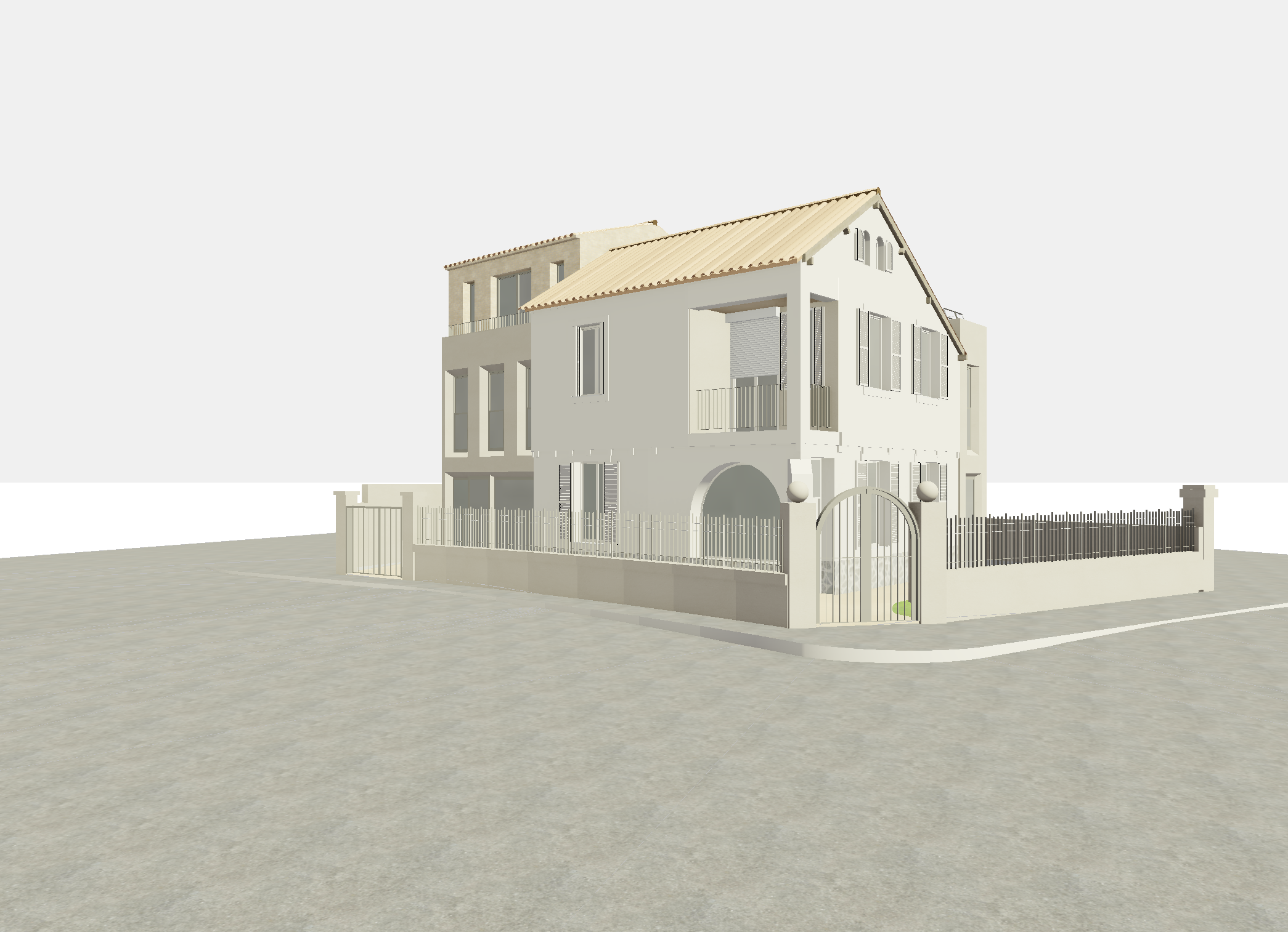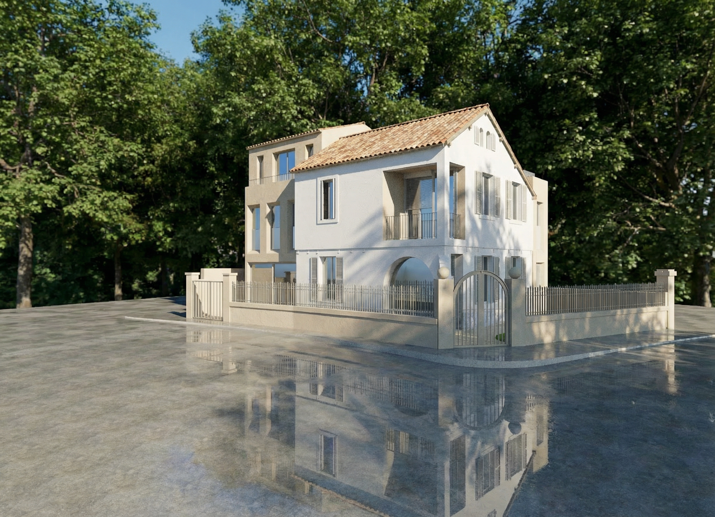 lot of reflects and sun light the sun illuminates the facade that we see some trees in the background facade more in the light more reflect all is painted no stone the fence call is beige like the extension more shadows of trees on the facade my point of view