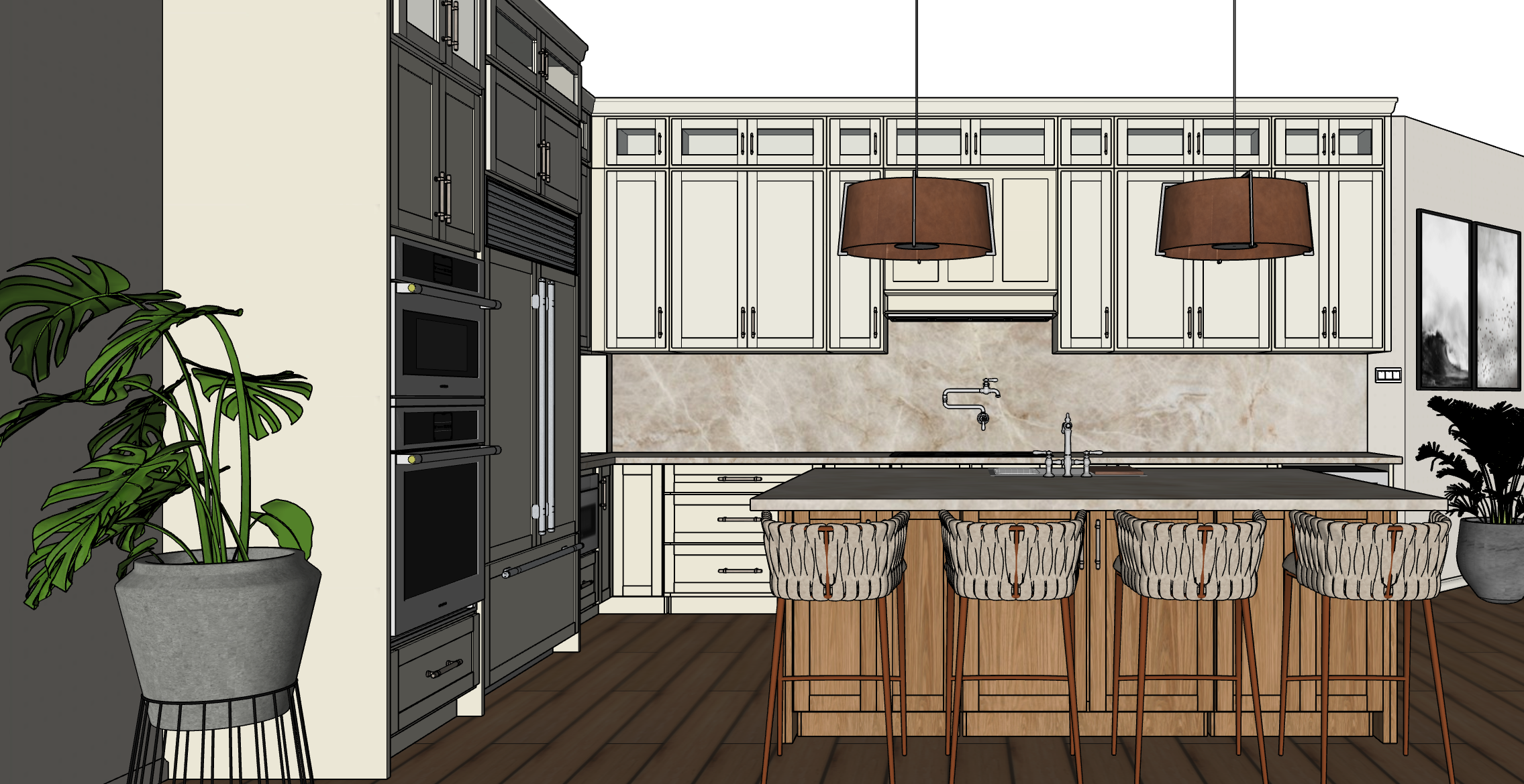 use this exact image as the main visual reference and maintain strict consistency across all renders interior architectural visualization of a high end contemporary kitchen with warm neutral tones and soft luxury styling maintain the exact same design language materials proportions lighting mood and styling elements from the reference image key consistency requirements off white shaker style cabinetry with slim bronze brass handles full height custom millwork with upper transom cabinets softly illuminated from inside large waterfall island with light beige creamy stone countertop and light natural oak wood base warm beige marble onyx look backsplash with subtle translucent veining dark herringbone wood flooring built in stainless appliances integrated into tall cabinetry under cabinet warm led lighting two large bronze copper rectangular pendant lights above the island upholstered counter stools with textured light taupe fabric and slim wooden legs soft beige walls elegant minimal refined luxury aesthetic photorealistic architectural render warm natural daylight mixed with soft interior accent lighting clean styling uncluttered surfaces subtle decor only preserve the same material tones texture realism shadow softness exposure balance and color temperature maintain the same upscale residential interior design identity across every image rendering style ultra realistic photorealistic architectural digest style high end interior design visualization soft shadows global illumination physically accurate materials natural lens perspective high detail realistic reflections consistent white balance warm and inviting atmosphere important do not redesign the kitchen do not change materials colors cabinetry style hardware finish flooring pattern island keep absolute consistency with the reference image in material palette cabinetry proportions stone texture wood tone metal finishes lighting intensity decor style and overall mood no variation in design language no extra objects no change in furniture design no color shift no style reinterpretation