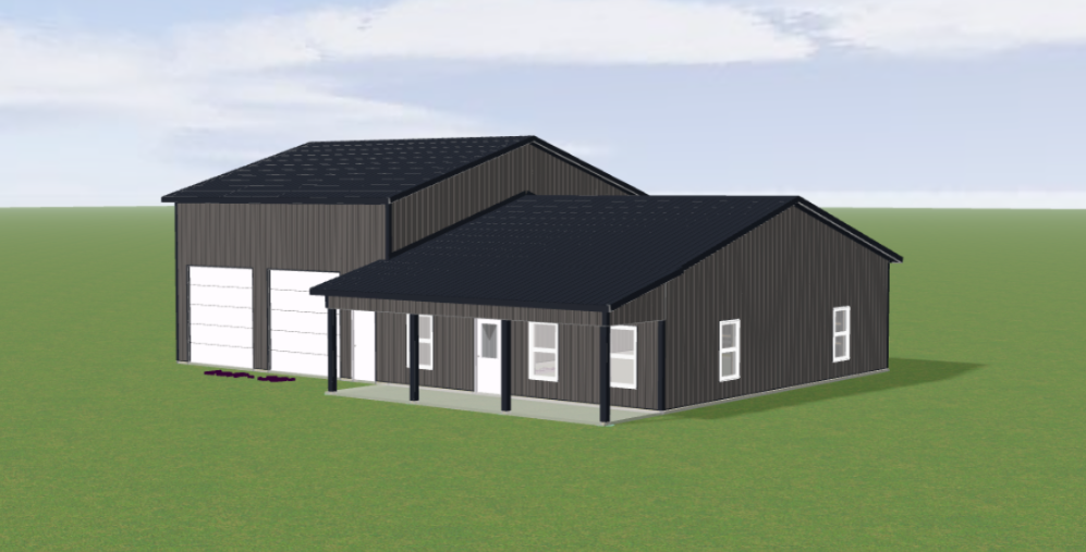 can you make this look more realistic as if taken by a camera add some rural trees in the background and make the yard look nice add a concrete driveway to the overhead doors