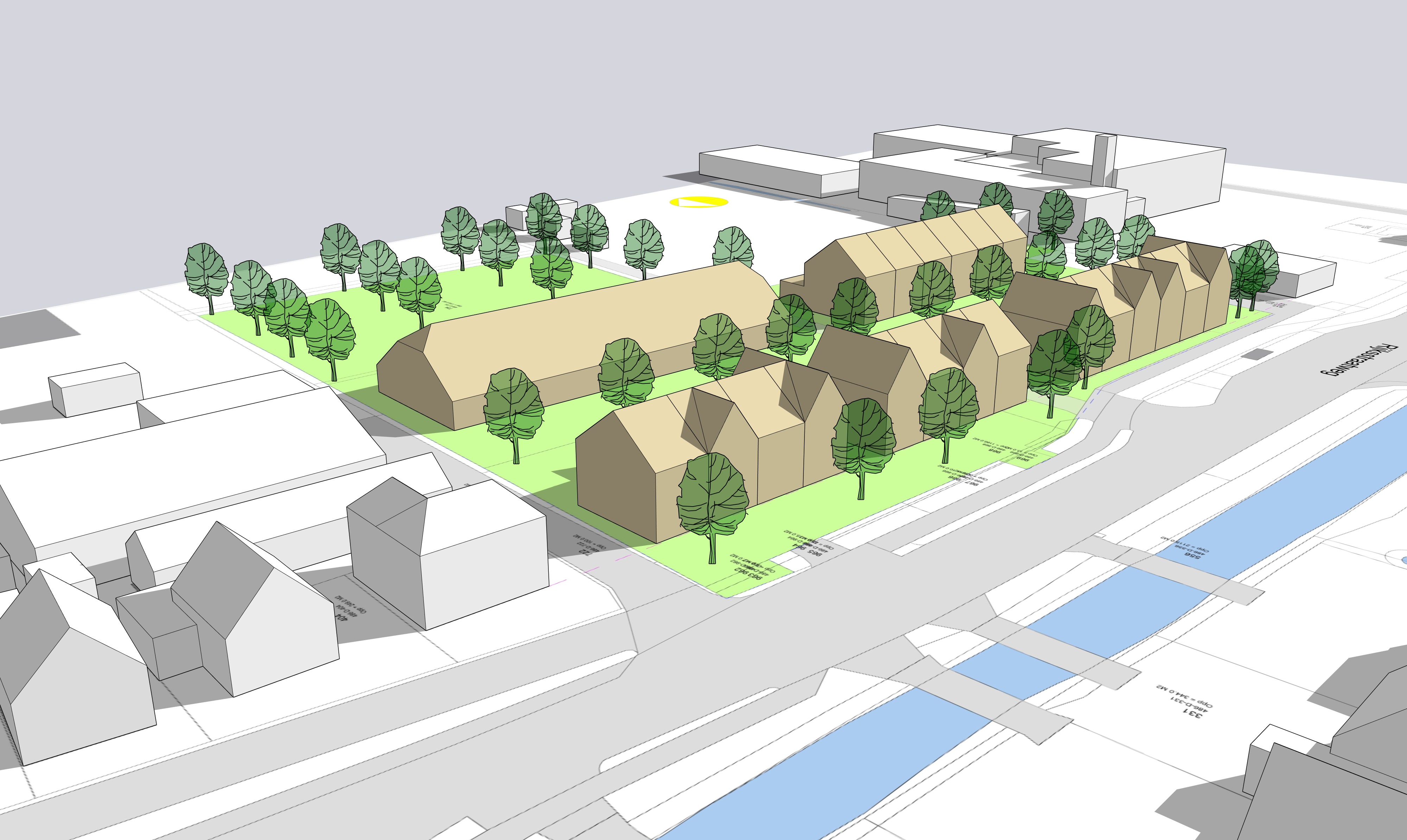 make a photorealistic rendering of this aerial image add a lot of trees people and cars the houses are made with dutch bricks and have differentiated facades the white buildings in de left side are also brick buildings the white building in the background is a school in the rest of the background there is a open dutch landscape