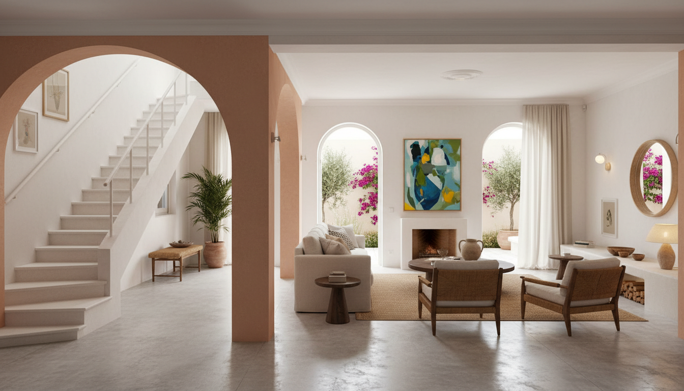photorealistic architectural render of an outdoor kitchen built in island viewed from a slightly elevated front facing angle the kitchen features a stainless steel built in gas grill 4 burners dome lid closed centered on the countertop to the left of the grill a triple stainless steel drawer stack with bar pulls below the grill double stainless steel access doors to the right of the grill one single access door panel and on the far right a stainless steel double drawer refrigerator unit with a black ventilation grille at the base the cabinet body is cream off white the countertop is a beige taupe stone or porcelain slab the floor is large format beige travertine look porcelain tile a white round structural column is positioned to the left of the island a sliding glass door is partially visible on the right edge the background features a dense green hedge shrub wall late afternoon golden hour lighting with warm vivid colors strong projected shadows cast across the tile floor and cabinet faces high contrast sharp details photorealistic quality open the grill lid create a cozu athmosphere with food and poeple
