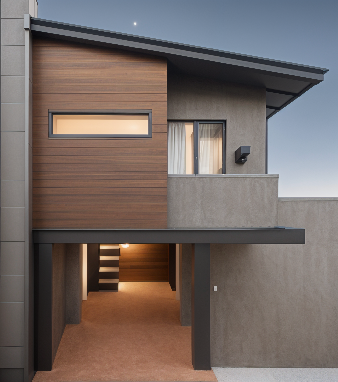 exterior shot dark brown paint for cladding and light brown balcony lighted wall lamp wood ceiling architecture