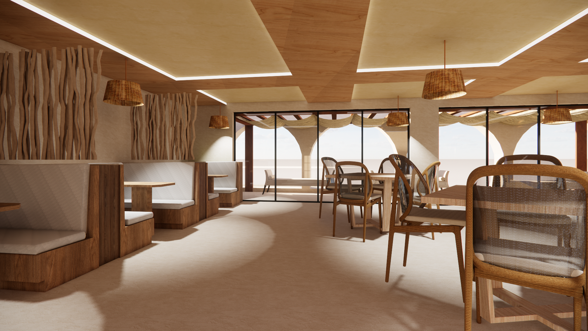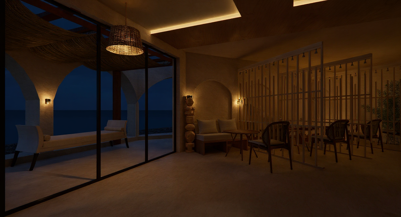 luxurious arabic modern interior inspired by the reference image asta studio warm beige stucco walls arched openings and soft ambient lighting create a moody elegant atmosphere from inside the lounge there is a clear view of the venice marina in djibouti with the sea visible through the arches the space blends arabic sophistication with somali design elements subtle geometric patterns handcrafted textures and natural materials include brass details wood finishes and lush greenery near the arches lighting is soft and ambient glowing from hidden wall lights and reflected surfaces giving the interior a warm intimate tone the composition feels refined cultural and modern rooted in horn of africa coastal identity while maintaining a dubai level sense of luxury