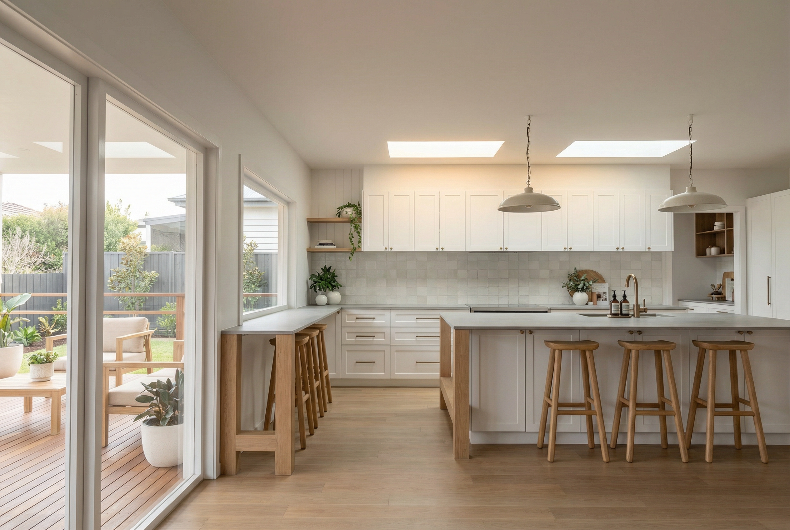 all cabinetry to be white shaker style pendant lights are these https lightingcollective com au products traditional ceramic pendant assorted size stone bench top to be https www caesarstone com au colours 4001 fresh concrete hand soap near kitchen tap is https alivebody com au products kitchen trio lemon pomegranate variant 43810328314096 country au currency aud tp cid 22748875176 tp id 762054959221 tp pid shopify au 8213717549296 43810328314096 tp source google gad source 1 gad campaignid 22748875176 gbraid 0aaaaab01yxqhra7btn0qohrmvf8mq dro gclid eaiaiqobchmi3frx89lfkgmvtmjmah3j5xlzeayyasabegisyfd bwe splashback tile is https dilorenzo com au products zelij collection chalk gloss 100x100mm please add some nice outdoor furniture to the outdoor deck and some landscaping there is a rail that runs in line with the kitchen please also include two horizontal skylights between the back cabinetry run and island bench timber finishes to be light oak bulkhead above full height cupboards