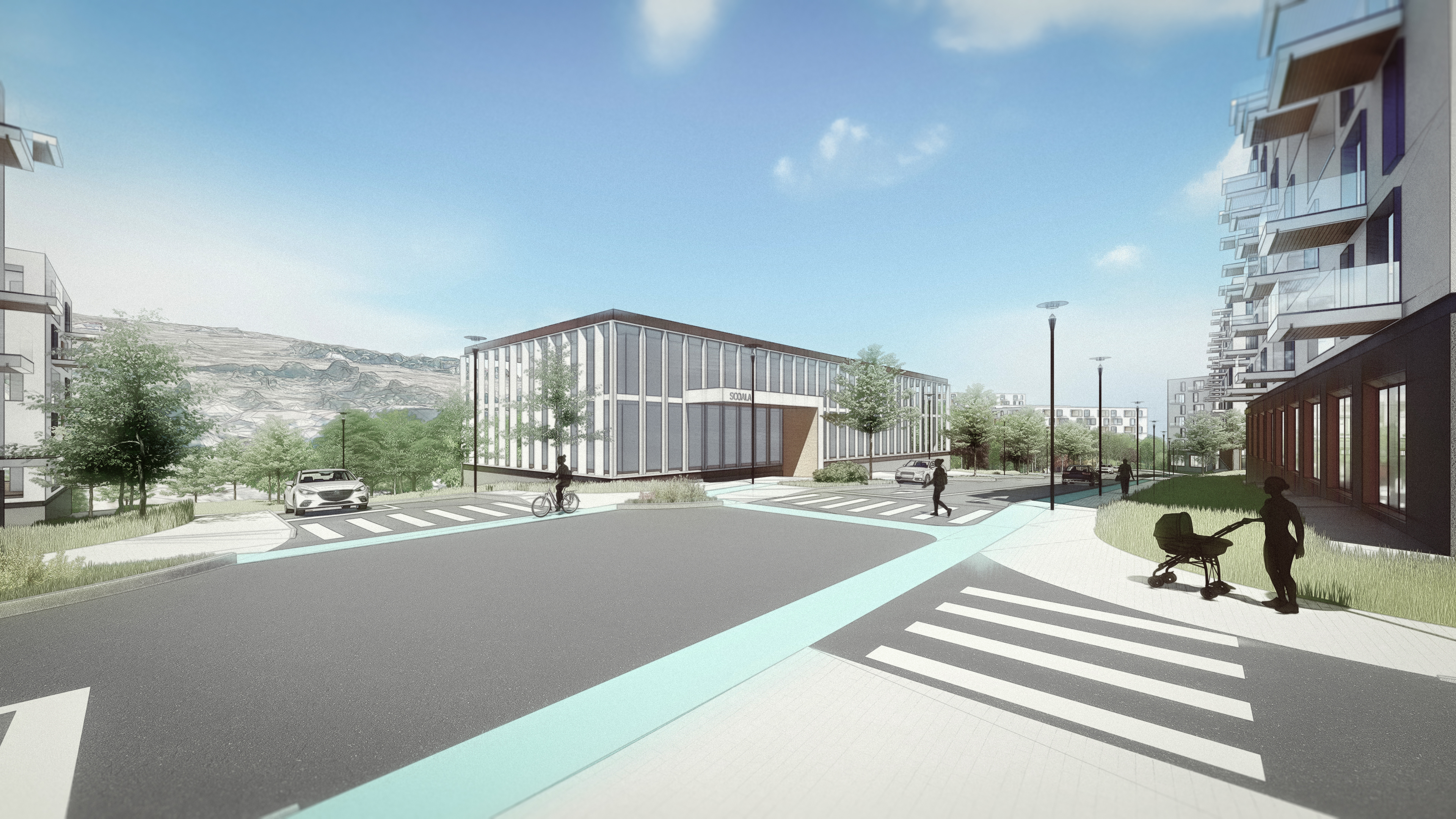 important preserve the existing geometry and the existing context exactly as provided do not modify alter reinterpret add remove scale or reshape any geometry do not change the site surroundings street layout neighboring buildings vegetation or context elements do not modify geometry scale proportions buildings road layout sidewalks or surrounding context in any way do not change text photorealistic architectural rendering clean and balanced contrast calm cinematic mood style contemporary european residential architecture minimalist premium understated delete all people and cars do not alter the church color soft overcast noon atmosphere diffused natural daylight with subtle blue grey tones cinematic architectural mood large glass surfaces with realistic reflections soft mirror effect subtle environmental reflections of sky and surroundings soft wet pavement with soft light bounce and blurred reflections high dynamic range lighting realistic global illumination soft shadows calm and minimalist nordic mood photorealistic architectural visualization balanced exposure no harsh highlights