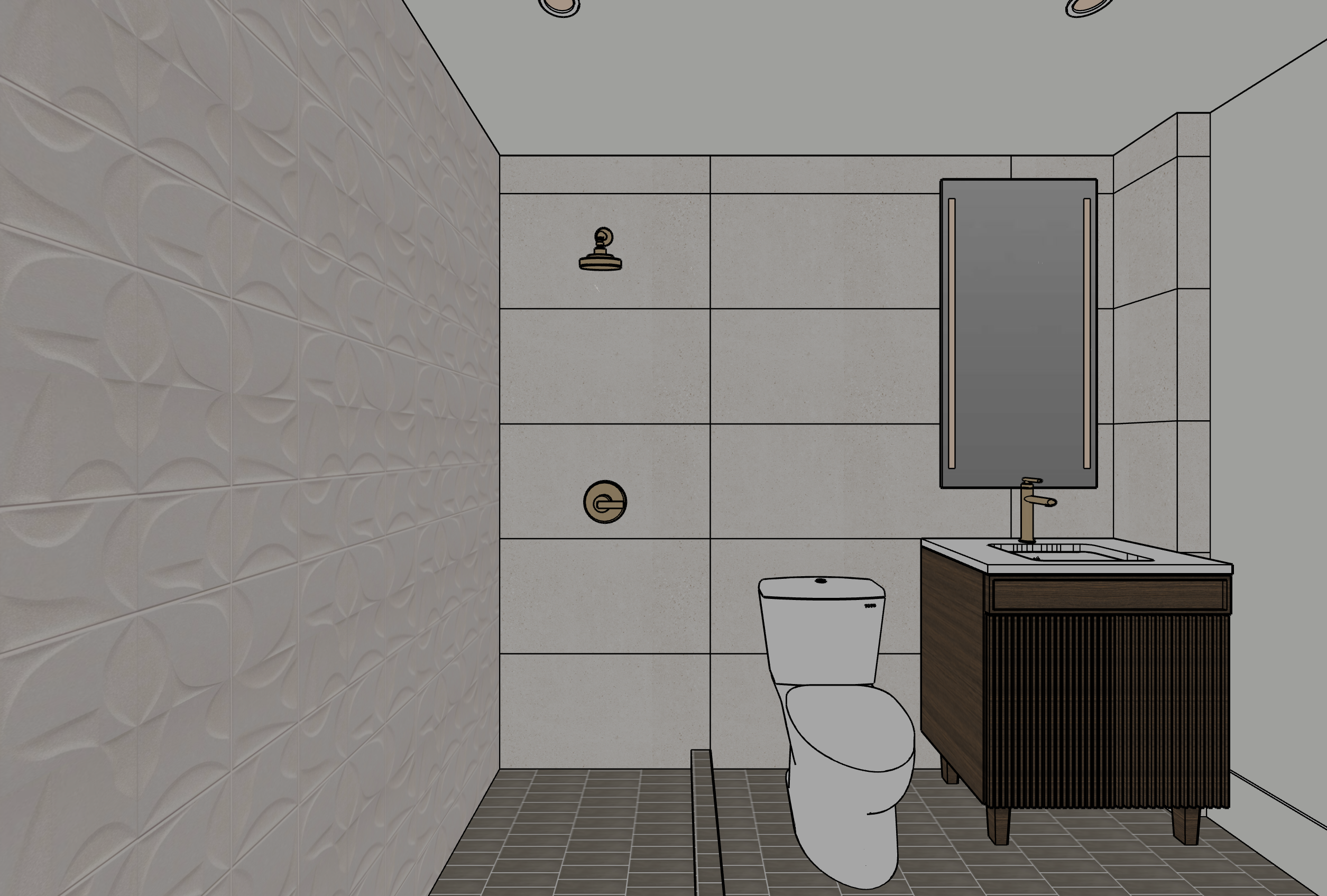 photorealistic enhancement of the provided architectural render preserve the exact architecture layout materials furniture placement and fixtures from the original image with no redesign or modifications the purpose is only to improve realism and lighting quality apply physically accurate global illumination and natural light behavior lighting should feel balanced and natural as in professional interior architectural photography soft indirect daylight fills the space with gentle light bounce from surrounding surfaces shadows are soft subtle and physically realistic with natural falloff all materials remain unchanged but respond to light more realistically stone surfaces with natural micro texture wood grain with depth matte flat painted walls with soft diffusion and brushed metal fixtures with correct reflections no surfaces emit light unless they are actual light fixtures plumbing fixtures such as shower heads and faucets must remain non emissive and only reflect ambient light metallic fixtures reflect light but never emit light the finishes should never have altered color or patterns render as high end interior photography using a full frame camera with a 24 35mm architectural lens balanced exposure realistic dynamic range subtle depth of field and natural color grading the image should look like a professionally photographed luxury interior rather than a computer render the scene should be bright but without unrealistic or unnecessary shows do not change architecture do not change materials no redesign no new objects no additional lights no glowing fixtures no light from shower heads or faucets no dramatic shadows no surreal lighting no warped geometry no stylization the plumbing fixtures and bathroom faucet should all be brushed brass the can lights in the ceiling should be emitting light and brightening the space the tile color and overall nature should not be altered the back wall tile should be white matte with subtle limestone texture the floor tile pattern should not change the led mirror should be turned on and shining light through the two light strips lastly the reflection in the mirror should show a solid white wall