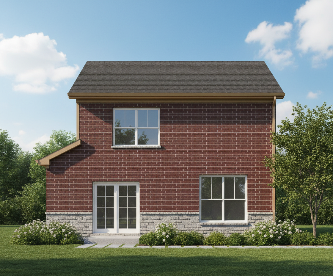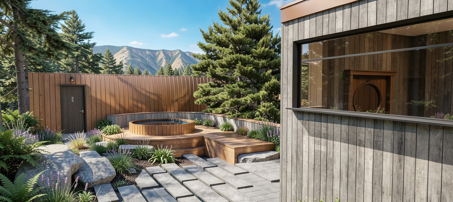 render a photorealistic 3d perspective of this house in a truckee ca reference the current material style just enhance them bronze standing seam metal roof verticle wood siding concrete walls keep model geometry the same windows doors roof walls garage door pavement driveway make a lush vegetation that looks native to ketchum idaho do not change the view only enhance the current materials and make the landscape nicer vegetation detailed textures in the wood siding and glass reflections and a vibrant clear sky with light atmospheric depth render in hyper realistic architectural visualization quality 8k resolution remove the black lines surrounding the trees the wooden wall shape in front of the background is a wood slat fence which is flat