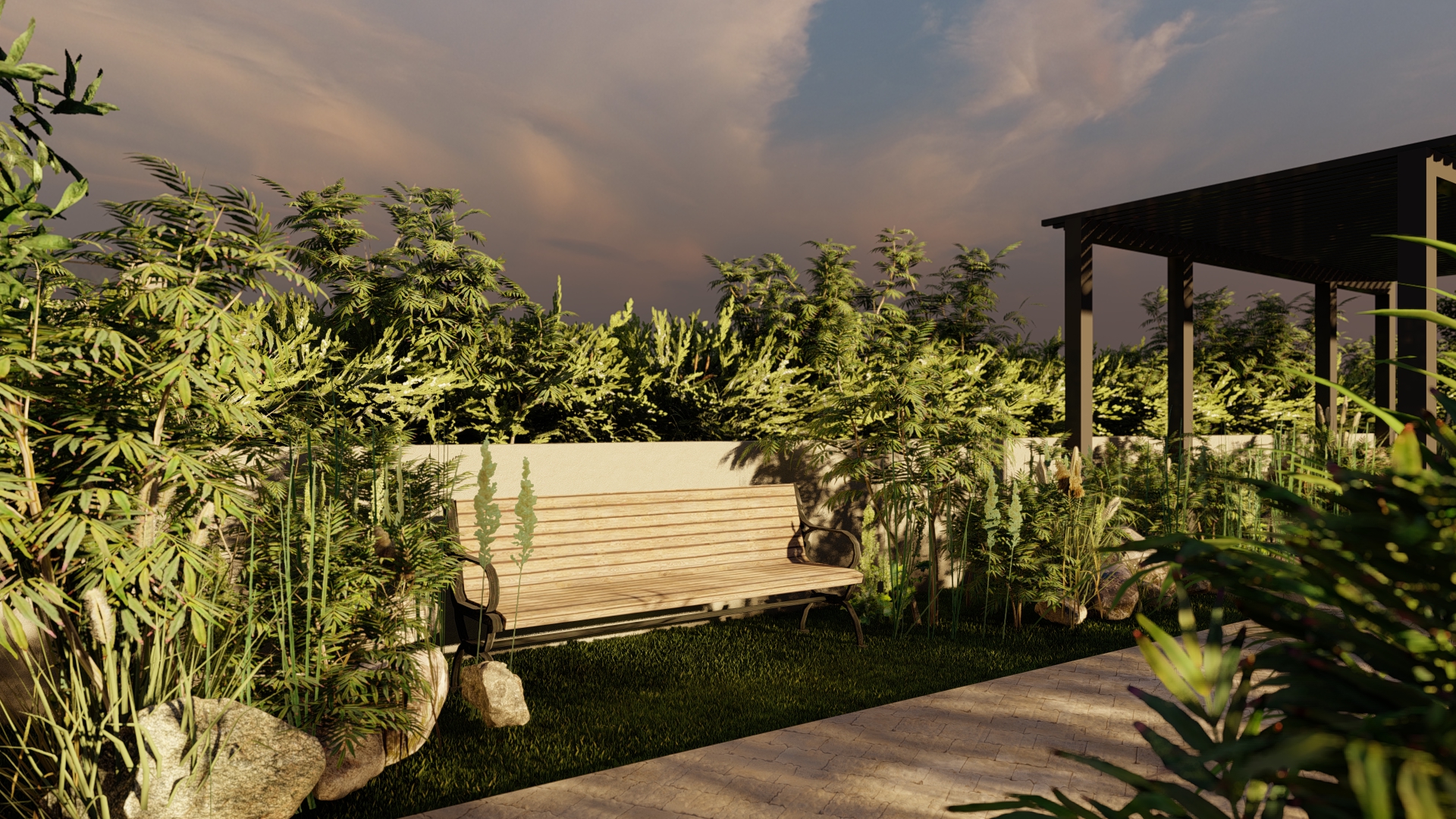 sunset lighting modern contemporary materials in warm gray and cream tones improve plants with more variation of tropical plants wood slats in the facade brick flooring in warm beige cinematic photorealistic 4k resolution 35mm camera lens