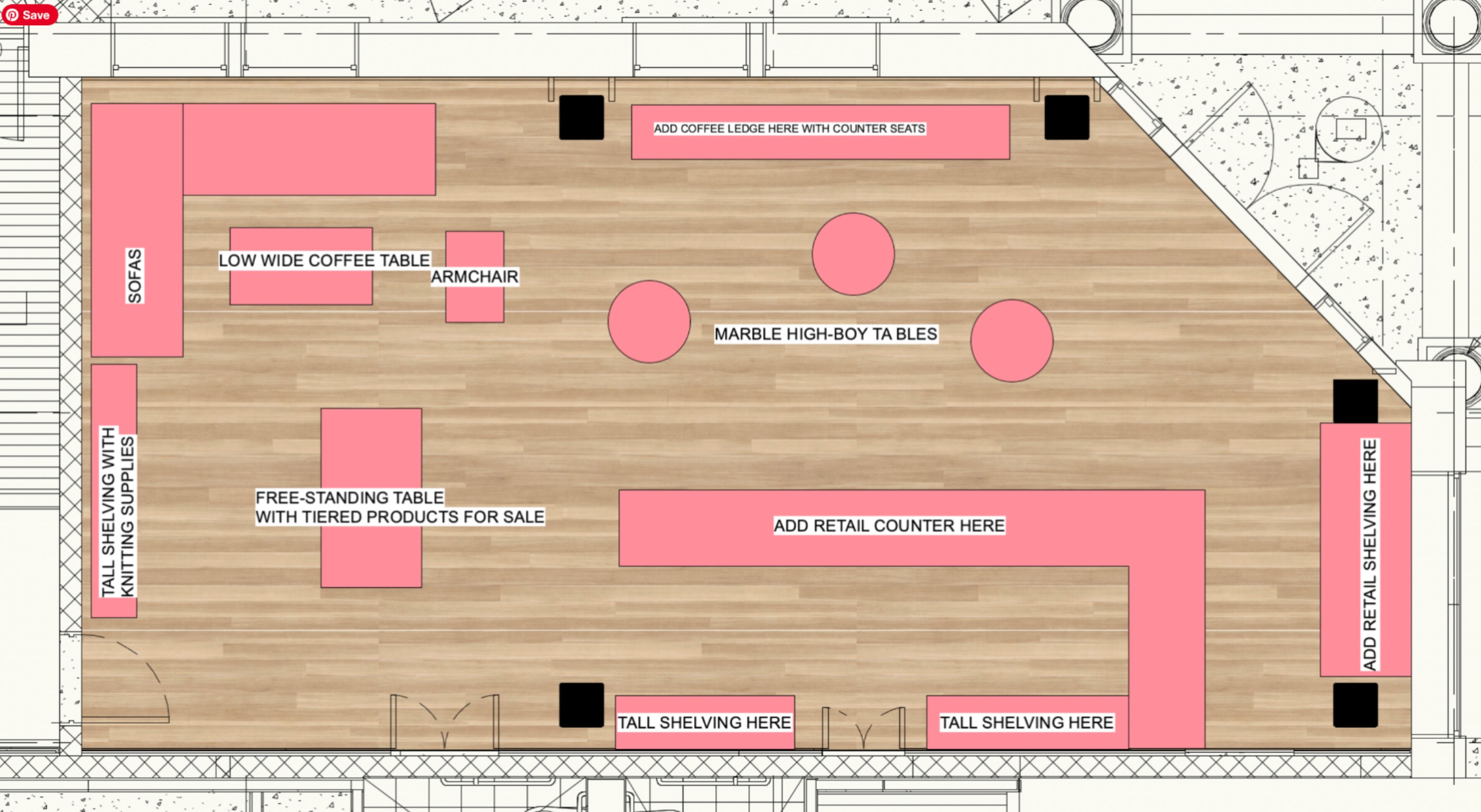 this is an overhead plan view of a former bank that is going to be converted into a cafe to go lunch spot and knitting space for the community it wants to be designed in the style of the https www sagaponackgeneralstore com create an overhead visualization of this space my thoughts on layout are indicated in text and roughly blocked out pink boxes