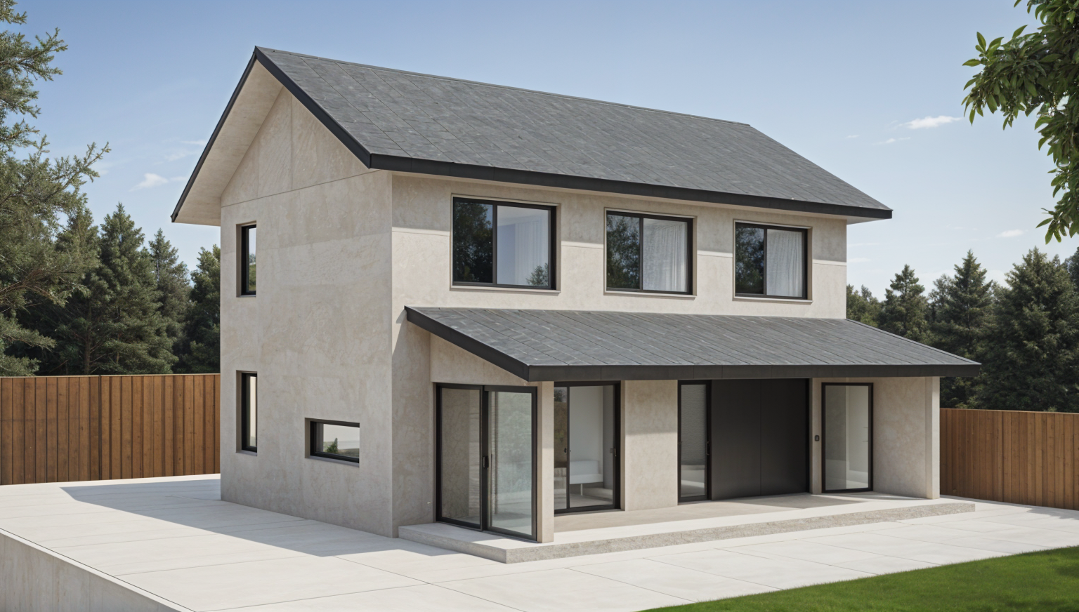 robert a m stern exterior shot render a modern two story house with a white facade and wooden accents the roof is a subtle gray color blending harmoniously with natural wood trim along the edges use clear large windows framed with rich brown wood the surrounding ground is a lush green with soft earthy browns where the house is elevated the atmosphere is serene and inviting with soft natural lighting creating gentle shadows conveying a peaceful suburban setting architecture