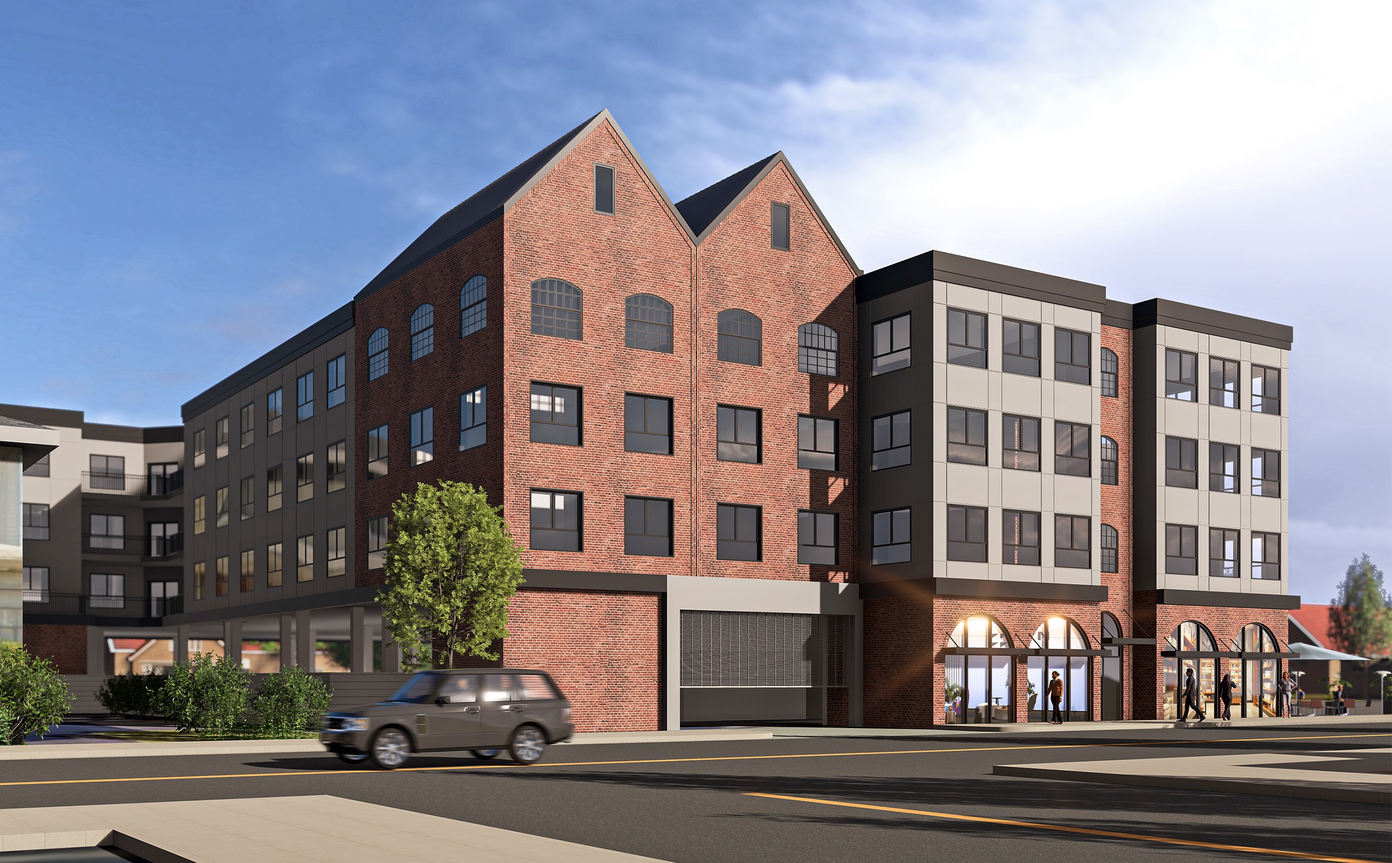 create a beautiful architecture magazine worthy image of this building keep colors textures and existing elements show cars people eating outside and a lively ambiance winter wonderland vibe not a corner building