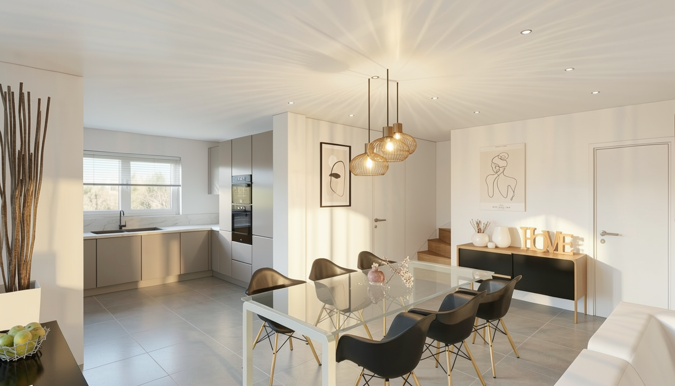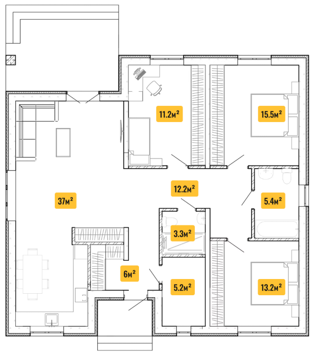 top view add furniture remove sizes and yellow blocks change small down middle room into a boiler room change stairs into a wardrope remove bar cahirs add plants table and chairs on terrase