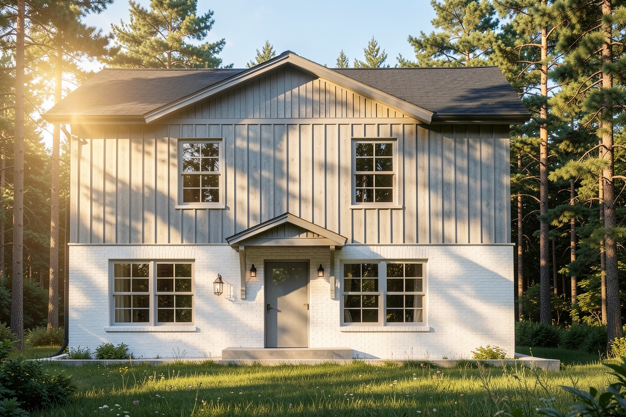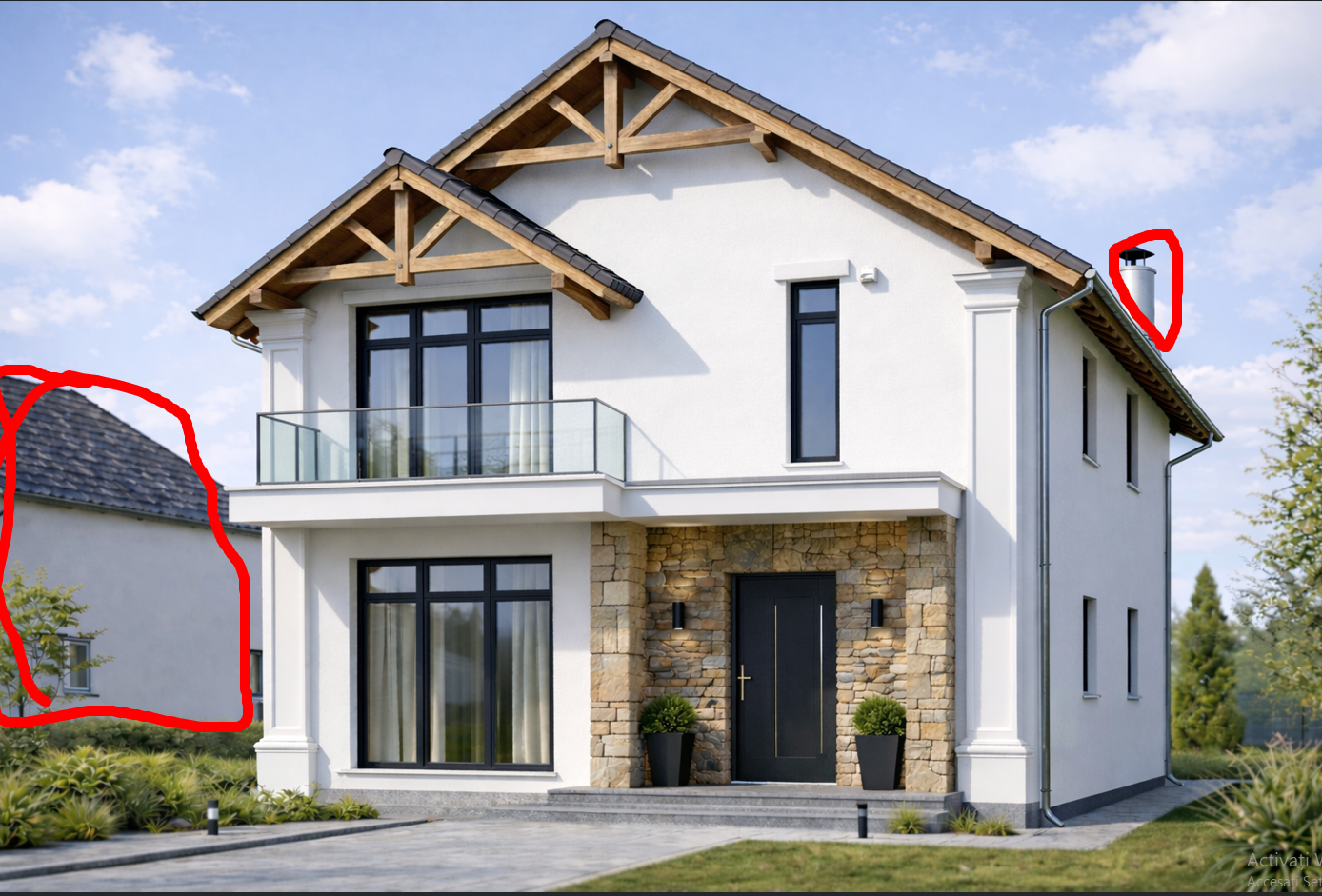 edit the provided image using precise local modifications only do not change the architecture proportions camera lighting or materials task 1 remove marked elements remove all elements marked in red the neighboring house on the left and the chimney on the right replace them naturally with the surrounding background extend the sky with realistic clouds match lighting color and perspective perfectly ensure seamless blending no artifacts or visible edits task 2 modify rainwater system change the color of all gutters and downspouts rain pipes to white same material just recolor to white keep shadows reflections and realism maintain thickness and geometry exactly important constraints keep the main house 100 unchanged do not redesign or reinterpret anything do not modify roof windows balcony columns or facade preserve photorealism style highly realistic architectural render clean seamless editing invisible retouching