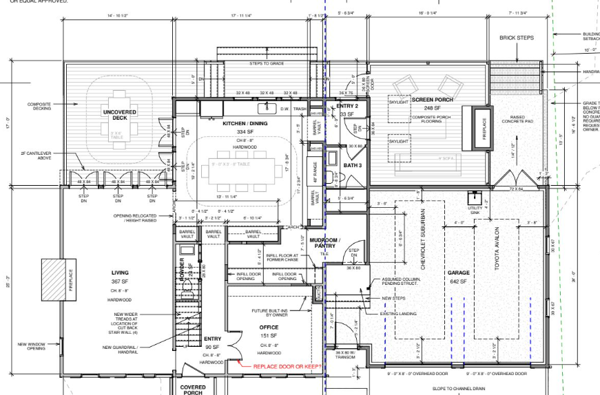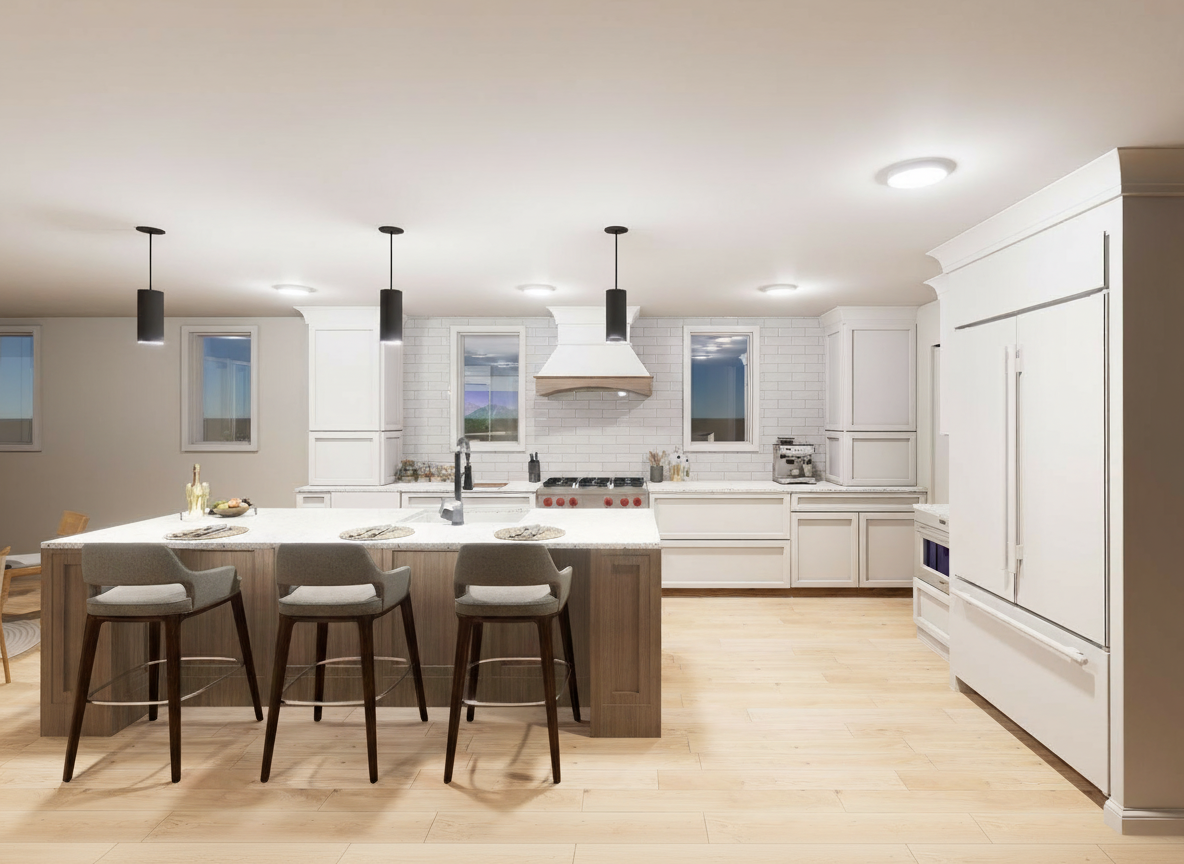 convert this floor plan into a realistic isometric 3d view of a full house show the space from an elevated angle with furniture walls and details visible create arches for all entrances to kitchen delete bathroom next to office and turn into butlers pantry add three french doors from living room to deck swap fridge and wall oven cabinet add appliance garage where refrigerator is change cabinet color to green use the same furniture as shows on the plan do not change the orientation of the floorplan