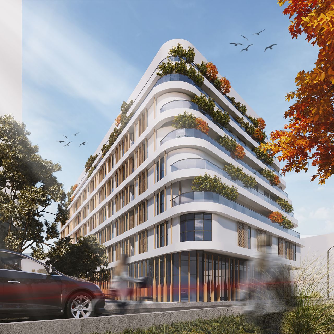 create a luxurious and vibrant scene of a modern apartment complex surrounded by abundant greenery include elegant trees placed mostly at the sides lush decorative plants and colorful bushes that frame the building without obstructing its view add neatly maintained patches of grass to enhance the landscaping show stylish people walking chatting and socializing along with sleek modern cars parked nearby or passing through reflecting the upscale lifestyle around the ground floor highlight lively activities such as upscale outdoor caf s with sophisticated seating areas boutique shops and people enjoying the evening atmosphere ensure the entire environment feels high class fancy and inviting with architectural details well lit and the ambiance polished and clear keeping the air crisp and sharp with no haze for a pristine and cinematic look