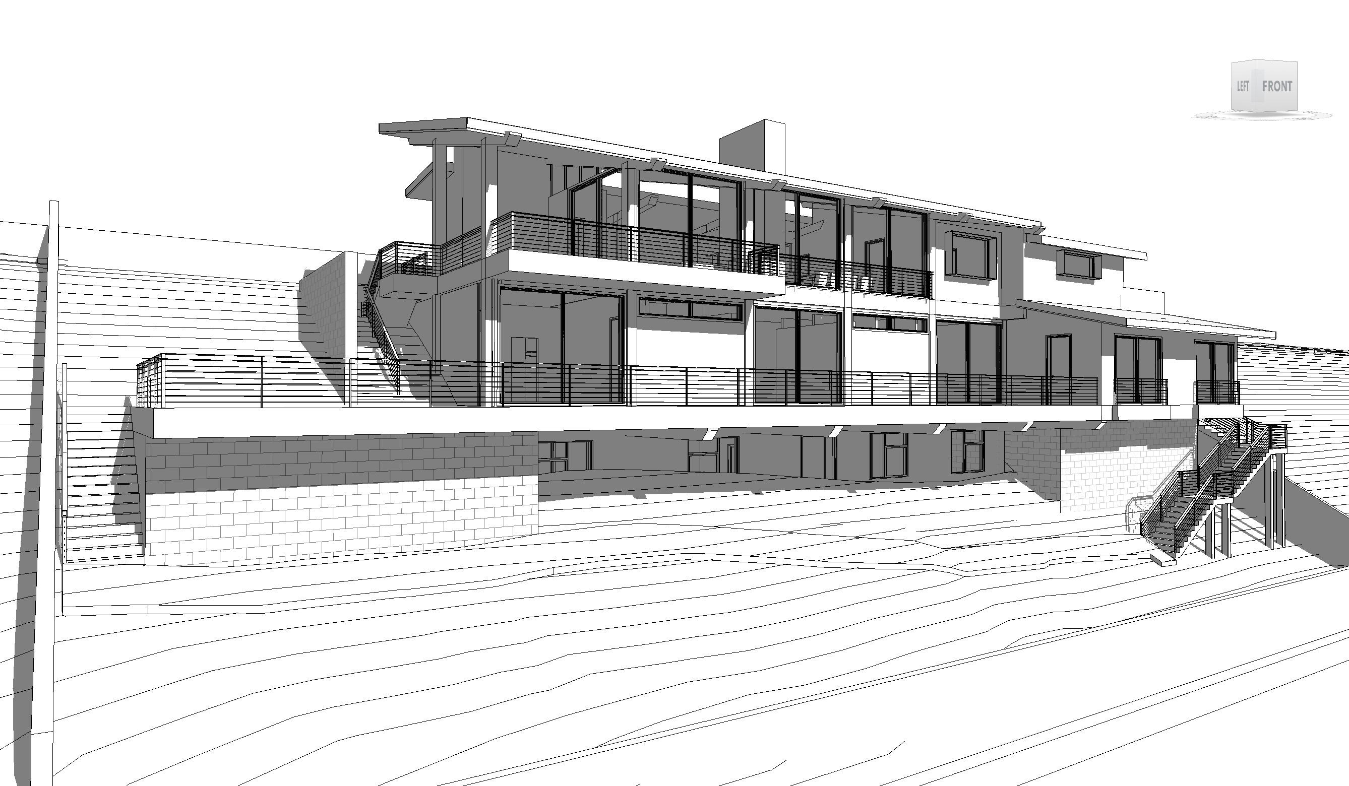 a mid century modern house on a hillside in pacific palisades ca with dark horizontal wood sidings and black metal trims wood ceiling with exposed wide flange steel beams painted black steel cable railings black metal fascia on decks black exposed rafters and beams board form concrete base level sloping grass area at base with native landscape and with neighboring houses olive trees native bushes and lush green grass dramatic early morning setting