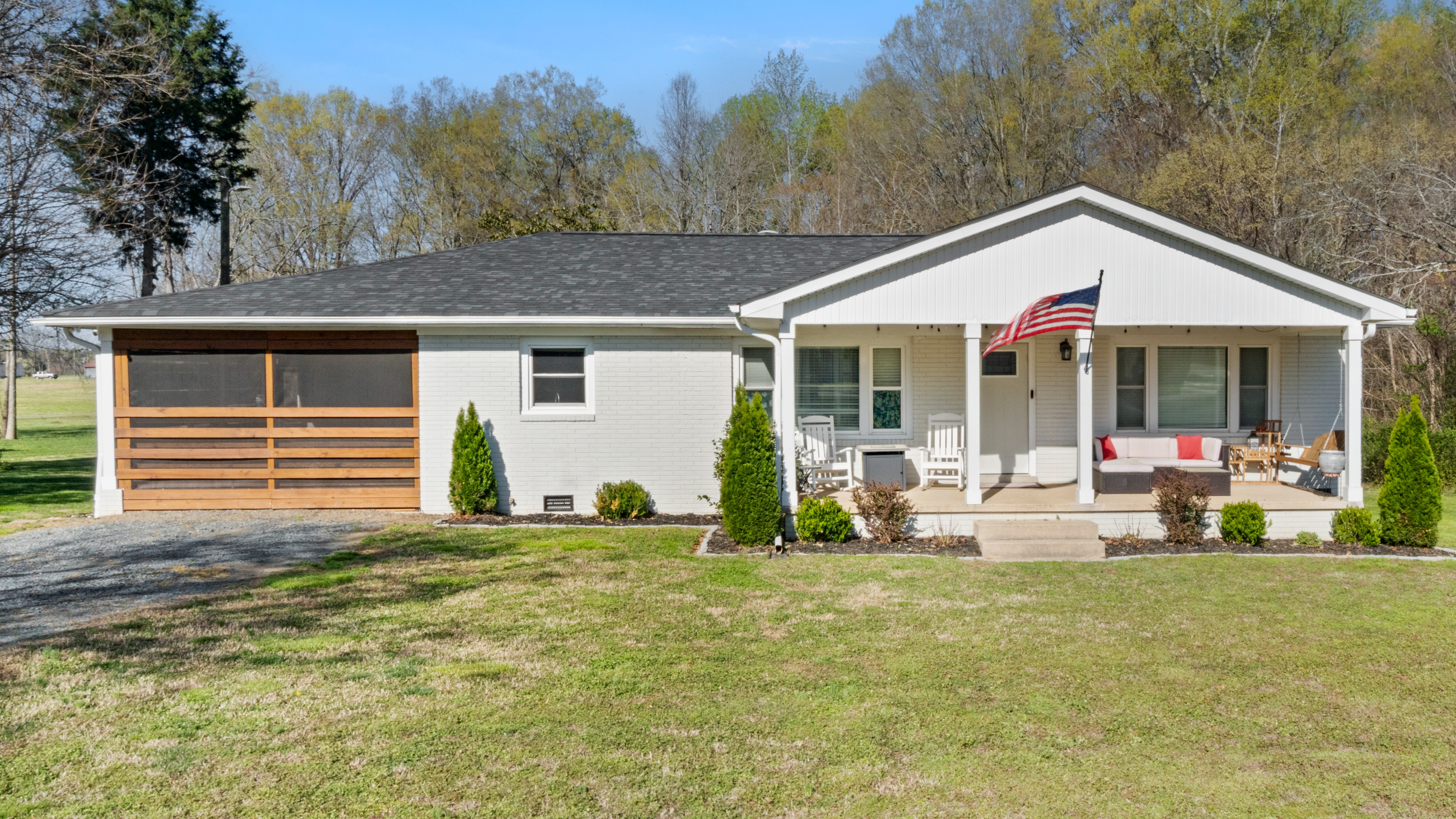 convert this daytime exterior real estate photo into a realistic twilight scene keep all property details identical house landscaping driveway lighting replace the sky with a sunset to dusk gradient add soft warm interior window lights realistic outdoor landscape lighting and subtle glow to exterior lamps ensure colors are natural not overly saturated and the home remains the focus