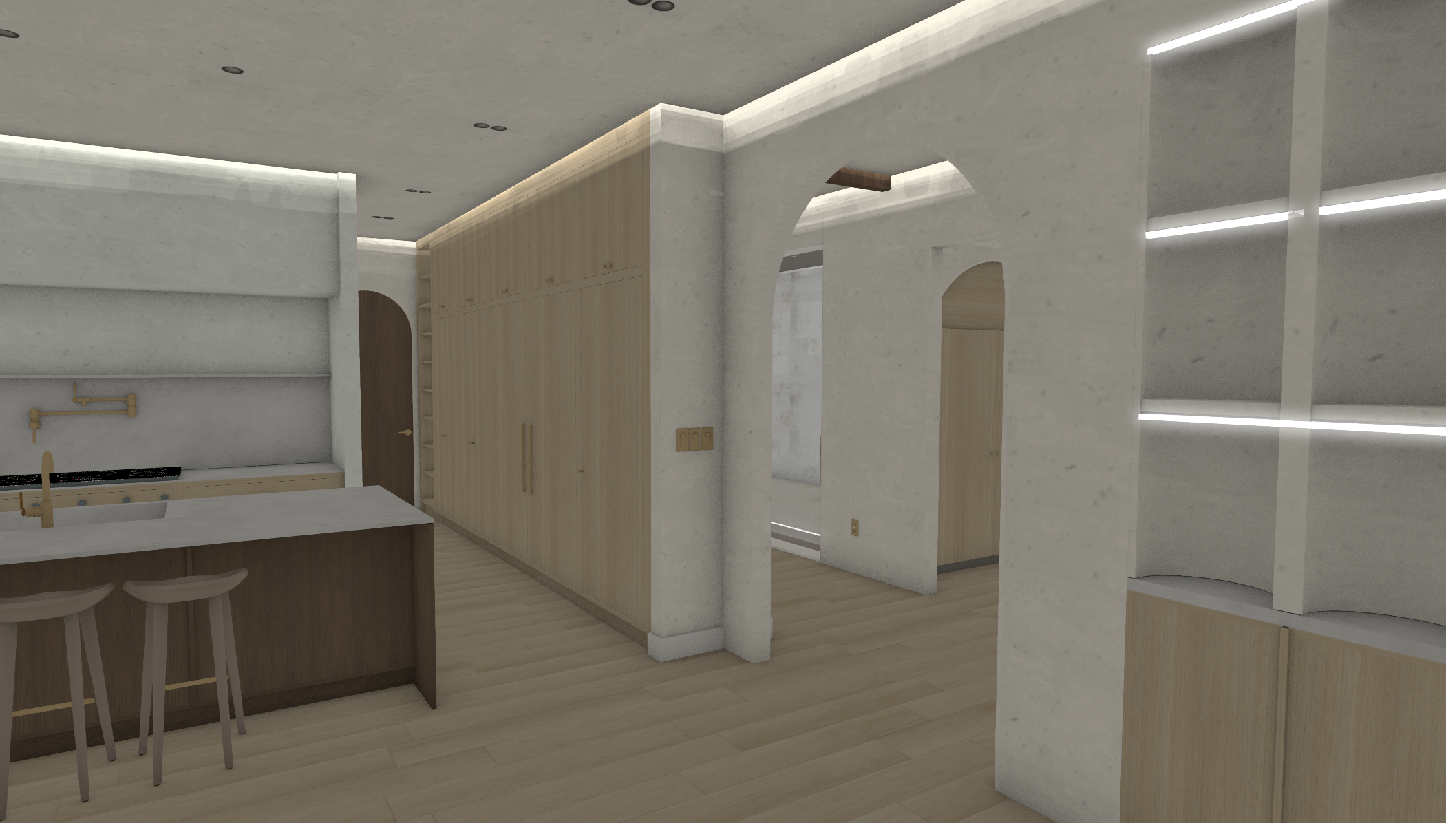 ai rendering prompt kitchen warm and cozy create a super realistic ultra high definition hd interior rendering based on the provided image showcasing the kitchen from this angle do not change the layout maintain the existing wall positions cabinet sizes and placements door locations ceiling heights furniture layouts and camera angles ensure exact proportions and perspectives as seen in the reference image overall intent this space should evoke a sense of warm and inviting atmosphere coziness with a touch of luxury functional yet aesthetically pleasing design perfect for family gatherings and casual dining moody ambiance with warmth from textures and materials walls architecture walls smooth light toned plaster or limewash soft warm undertones beige or light taupe matte finish with a subtle texture no flat paint no sheen ceiling light color slightly warmer than the walls matte finish to create an open feel flooring type light natural wood flooring as shown soft texture that absorbs sound and feels warm underfoot no gloss no pattern changes cabinetry appliances cabinets maintain the existing light wood cabinetry ensure visible grain and texture no changes to arrangement or style countertops keep the countertop texture natural and warm light color that harmonizes with cabinetry lighting key to warmth primary lighting soft ambient lighting with warm color temperature 2200k 2700k integrated lighting under cabinets should be subtle and inviting no harsh edges or bright spots accent lighting soft glow from any overhead fixtures emphasize textures without creating stark shadows color palette warm beige soft taupe light wood tones muted neutrals only avoid cool colors or stark contrasts realism requirements achieve photographic level realism showcasing natural imperfections in materials ensure soft shadow gradients that add depth avoid cgi sharpness and artificial cleanliness focus on rich material depth and warmth