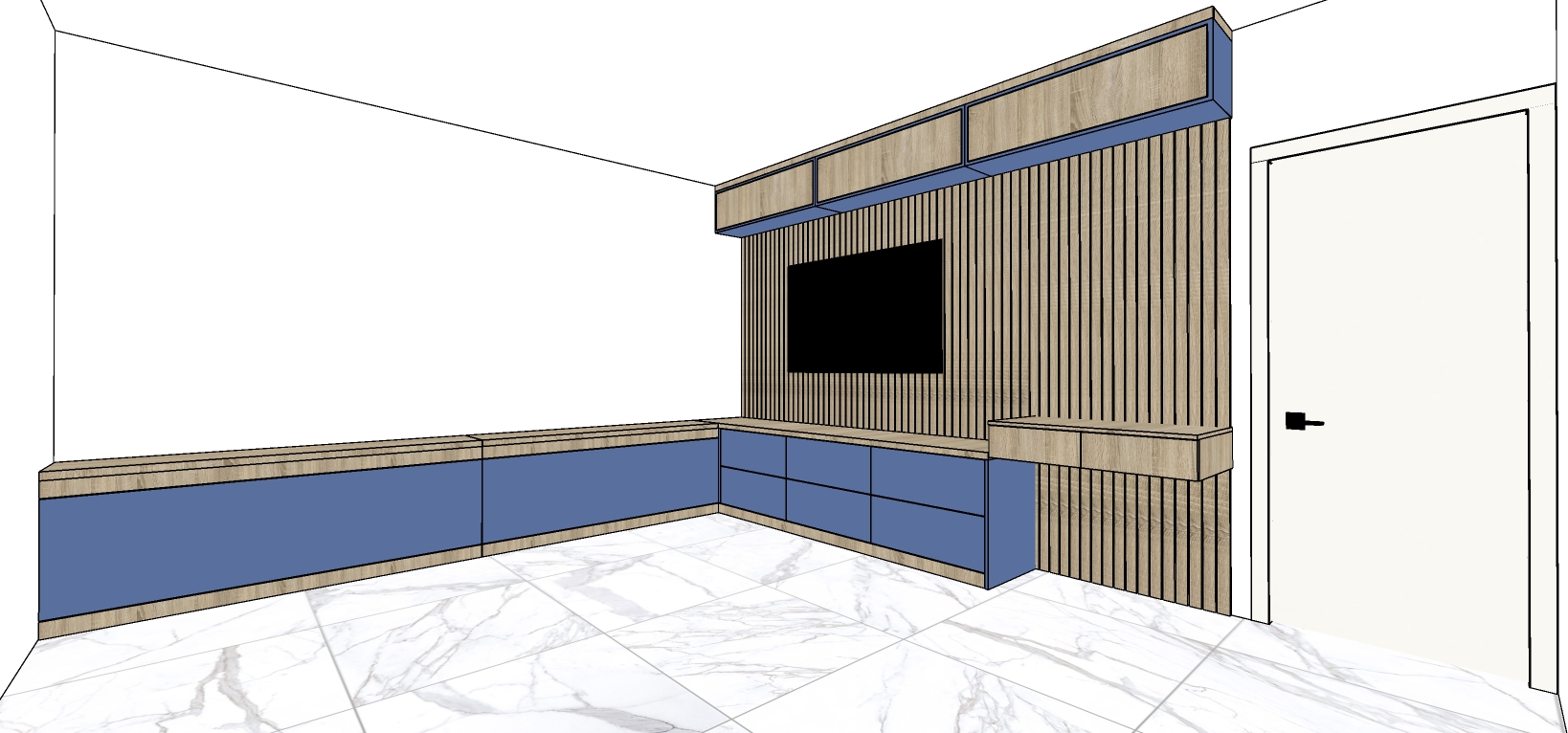 transform the provided image into a real professional interior architectural photograph with dslr quality and true photographic realism preserve exactly the original architecture layout proportions materials cabinetry furniture placement and camera framing the scene shows a living room tv wall composed of a vertical wooden slatted panel in light wood tone covering the main wall a black rectangular television is mounted at the center below the tv there is a light wood bench under this bench there is a central cabinet with six matte blue drawers above the panel there are three horizontal upper cabinets with light wood doors and blue structure on the left side there is a long low bench with a wood top on the right side there is a support countertop near a white door with a black handle with the slatted panel continuing below the floor is white marble look porcelain tile with gray veins the side wall is plain white camera position height angle and perspective must remain identical no redesign no optimization no stylization apply physically accurate lighting exactly as in the reference image natural light behavior only avoid cgi render 3d illustration cartoon fake materials plastic textures wrong wood grain direction oversharpening oversaturation fisheye distortion warped perspective