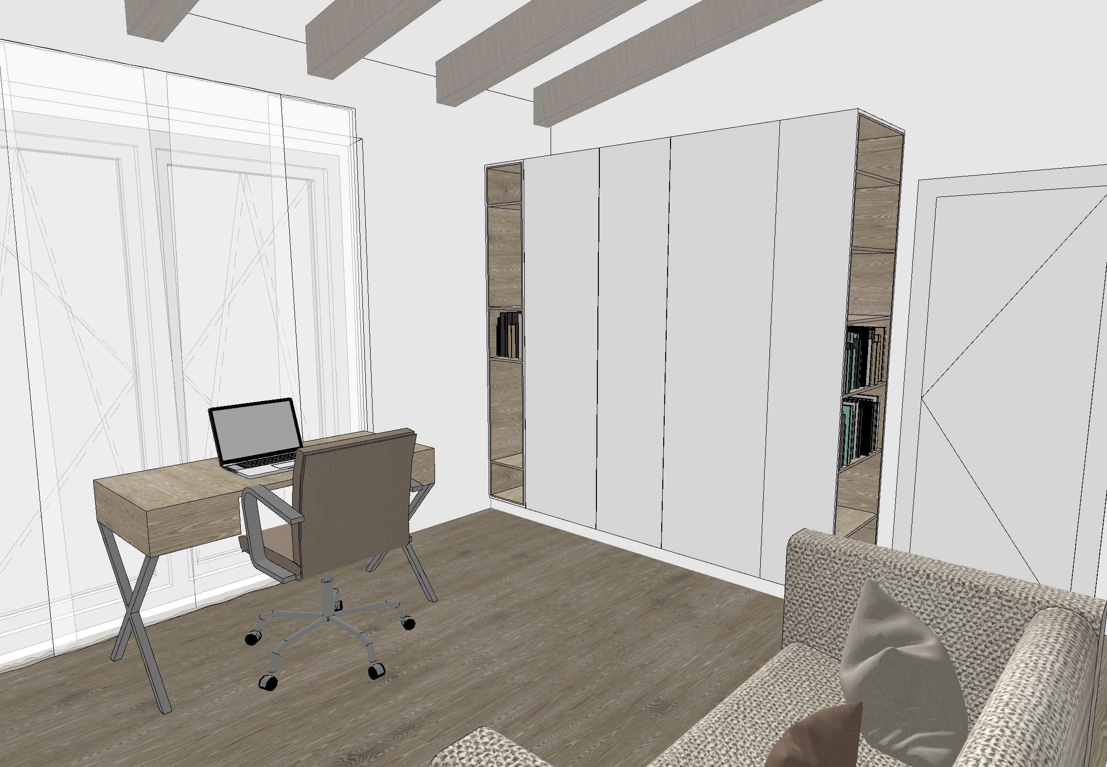 realistic photo of a home office in daylight bright and welcoming atmosphere white walls ral9016 white built in cabinets ral9016 open shelves in light non red or non yellow oak wood wooden desk in a light oak with chrome legs light white semi transparent curtains ergonomic vitra desk chair with light leather upholstery and chrome frame white ceiling beams jab taupe fabric sofa folded keeps the position as it is decorative office elements such as books binders and vintage accessories macbook laptop notebooks crystal water glass and coffee cup on the desk warm 2700 k lighting harmonious composition tidy and elegant workspace with a cozy lived in feel no orange or yellow material look