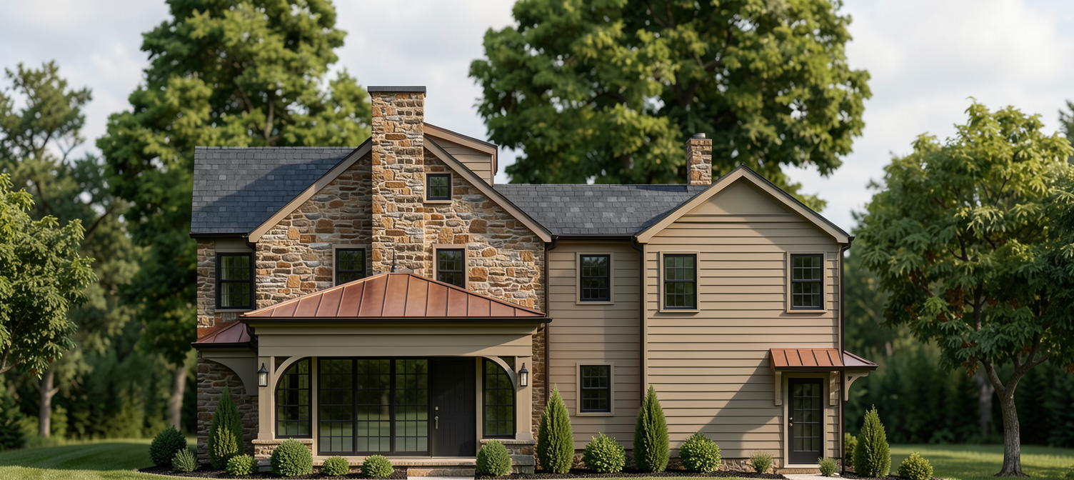 lot of reflects and sun light the sun illuminates the facade that we see some trees in the background facade more in the light more reflect all is painted no stone the fence call is beige like the extension more shadows of trees on the facade my point of view the right part of the house is white