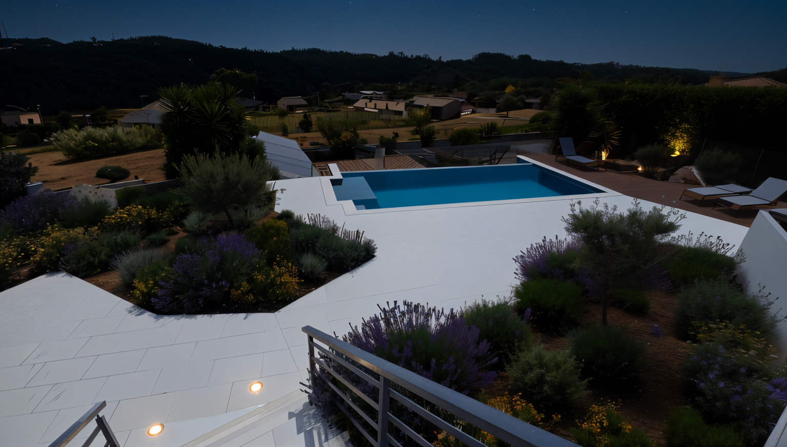 generate a night view with recessed spotlights near the corners of the pavement angles and two spotlights marking the entrance of the stairs on the ground near their base on the right behind the sun loungers and the palm tree place a tall hedge place indirect lighting spotlights inside the areas with vegetation place a pair of recessed spotlights on the wooden deck edges