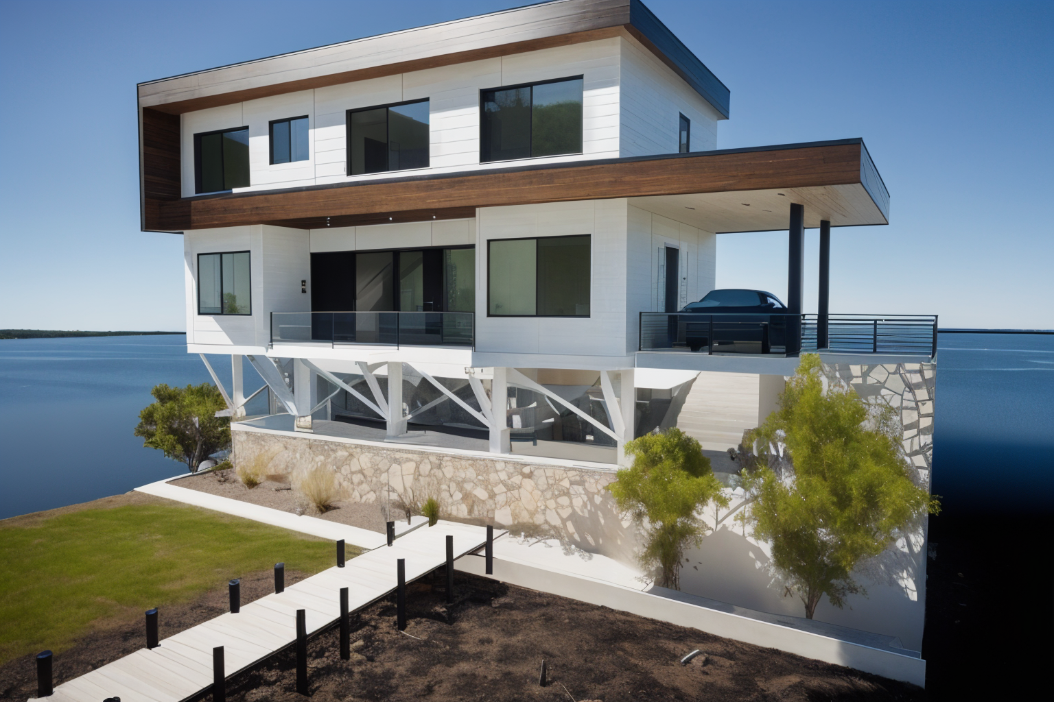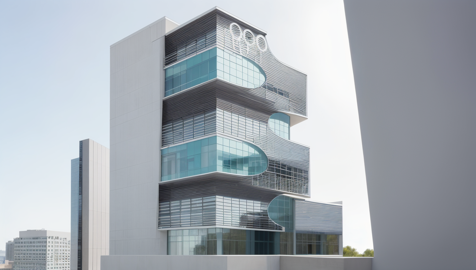 render a modern office building with flowing curves and sleek lines the structure is primarily glass and steel incorporate reflective blue tinted glass windows and dark gray steel beams place the building against a crisp blue sky with hints of clouds add greenery around the base with vibrant green trees and shrubs the atmosphere should be futuristic and sophisticated using a soft ambient lighting to highlight the building s contours and materials architecture