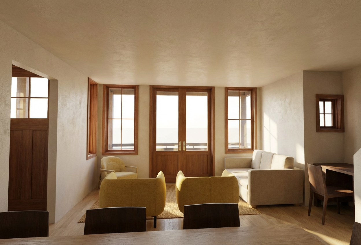 convert this floor plan into a realistic isometric 3d view of a full house show the space from an elevated angle with furniture walls and details visible there is a single double garage door and a single garage door on the left wall of the garage and windows on the front face of the garage use the same furniture as shows on the plan do not change the orientation of the floorplan