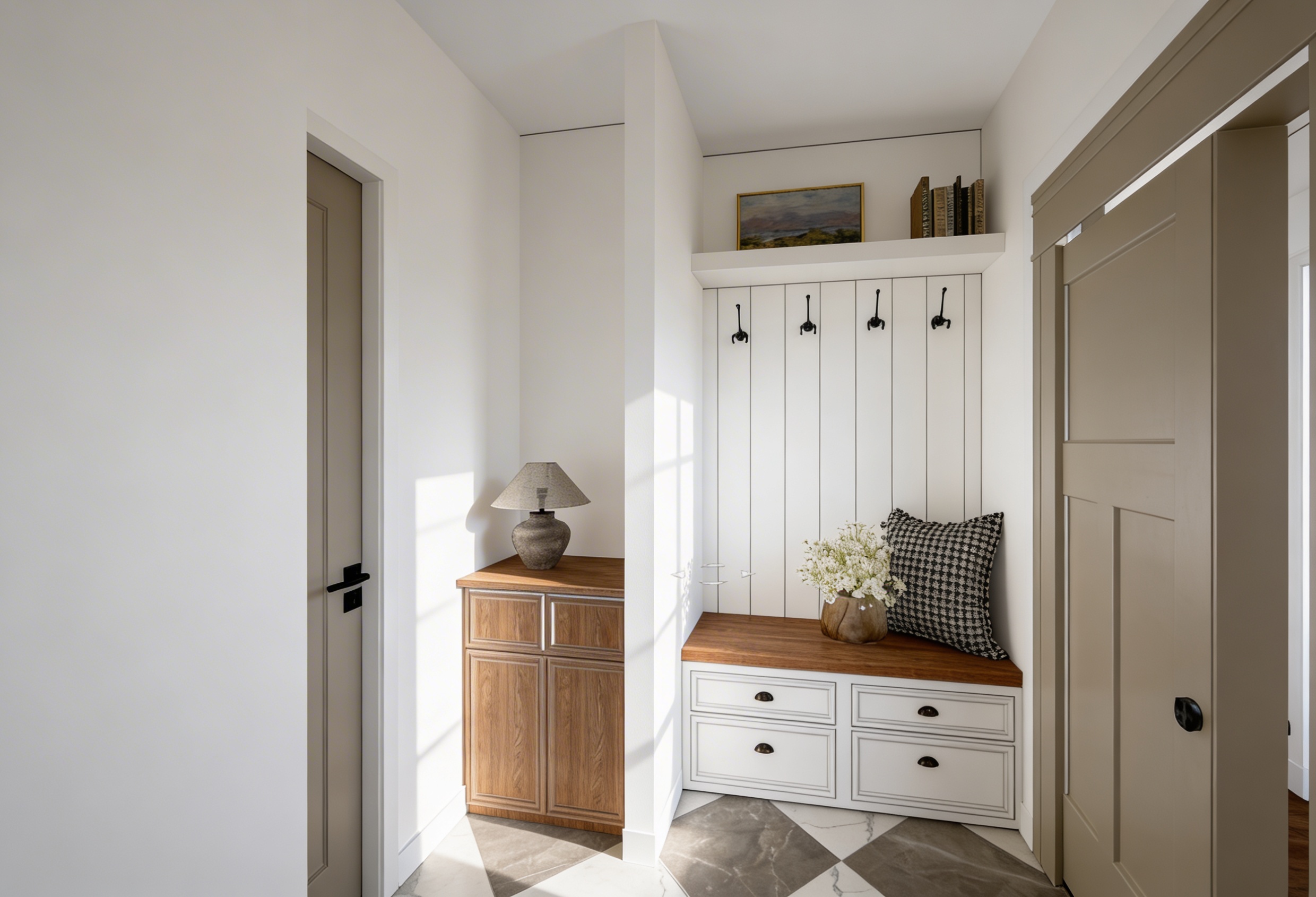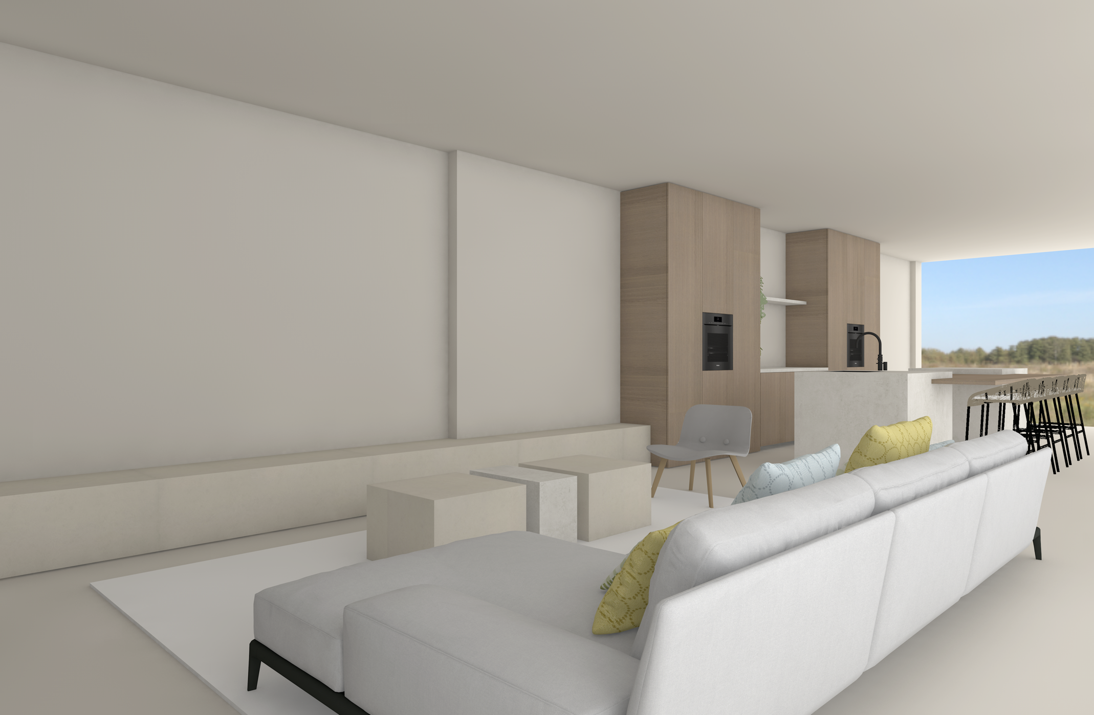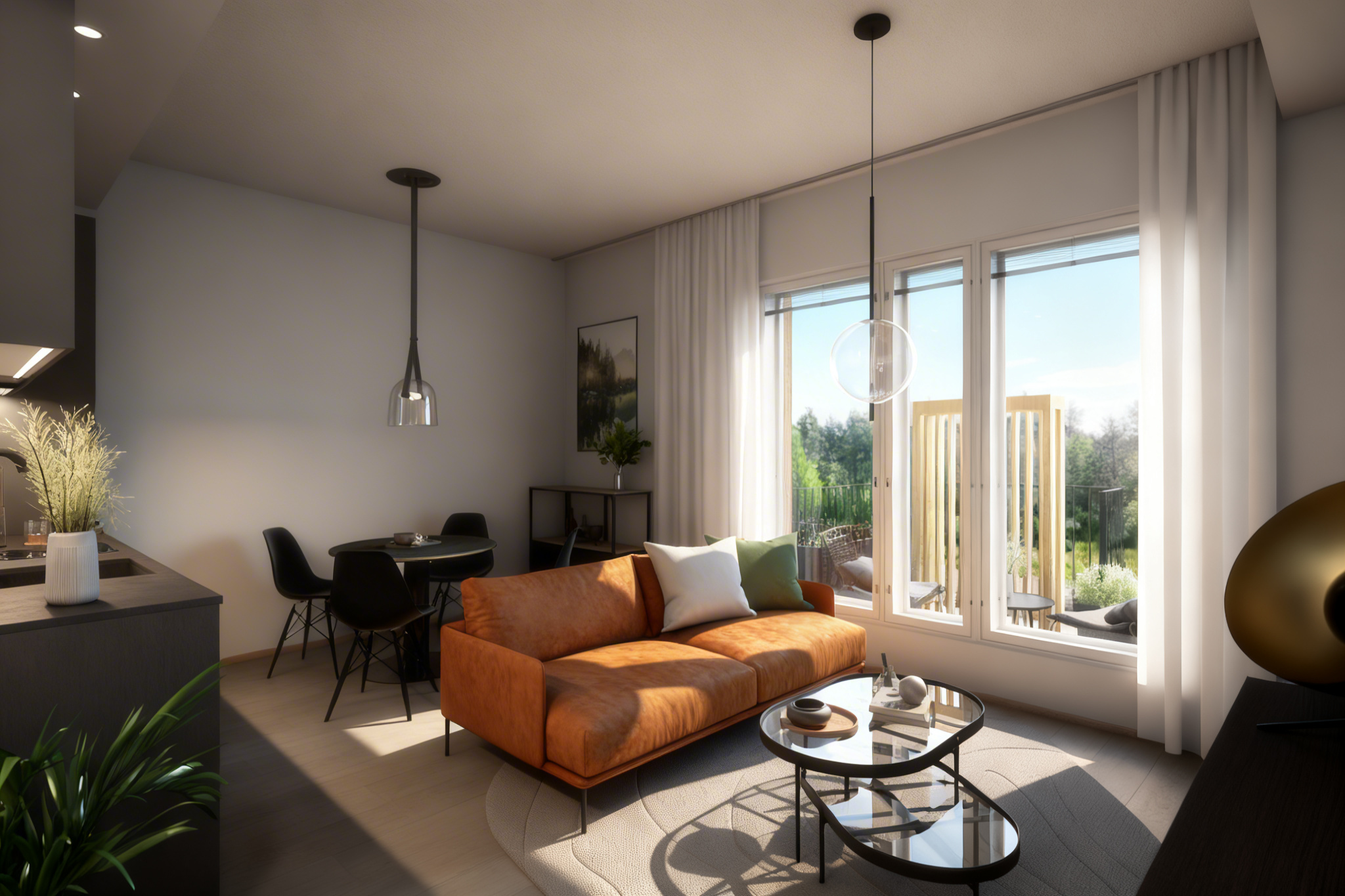make a photorealistic render wtihout changing the perspectif keep the materials close to the original and put a tv jusr above the cabin on the wall and a minimalistic fireplace put a hanging horizontal ligth the flos belt leather above the kitchenisland and put in the back black framed sliding doors make the whole couch and chair a closed material in beige grey put a plant on the tv stand