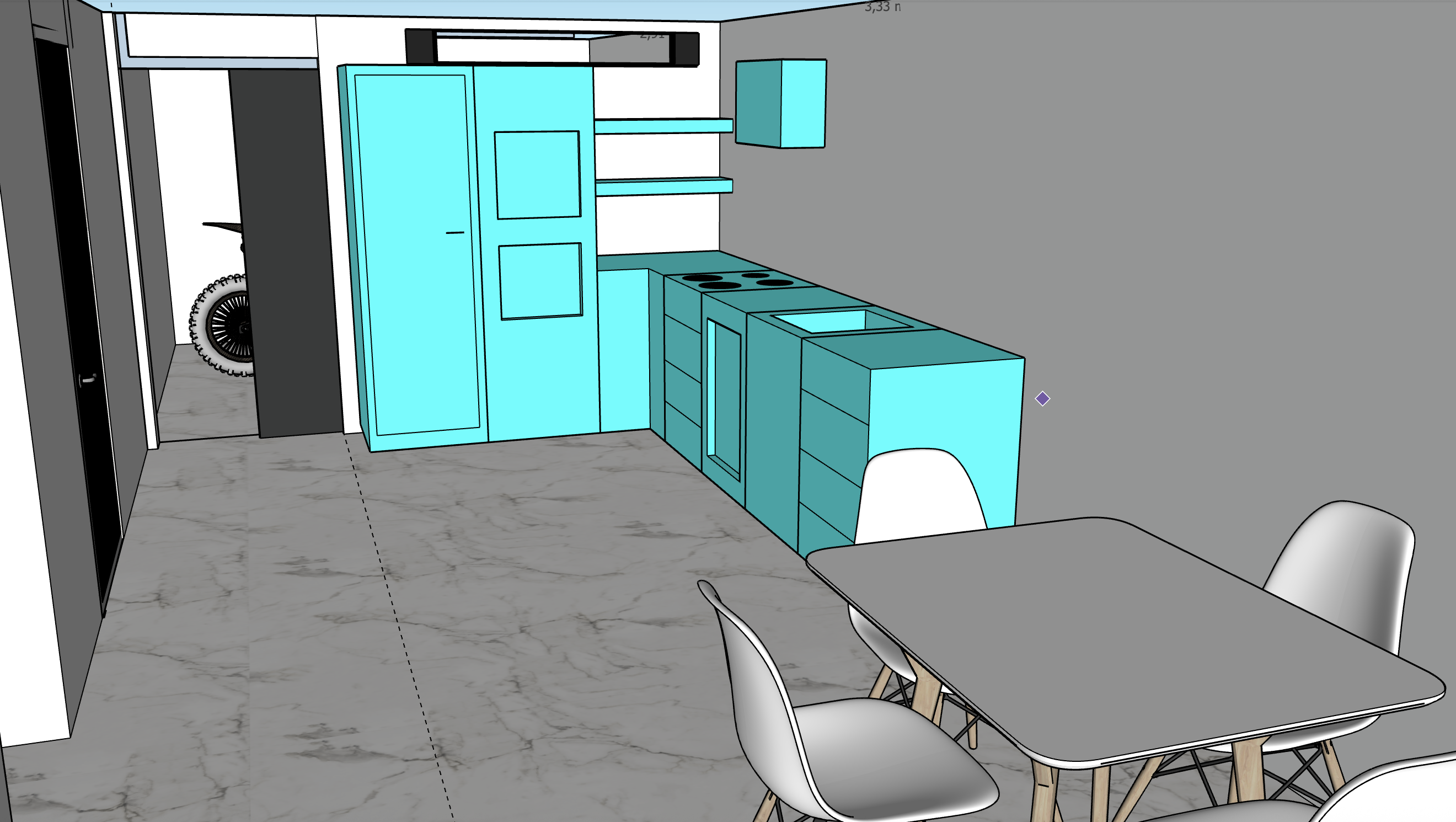 use the uploaded image as strict geometry reference do not change layout proportions or appliance positions modern scandinavian l shaped kitchen calm and natural color palette integrated built in design with clean lines and minimal details tall cabinet on the left with integrated fridge built in oven and microwave in the same unit base cabinets and drawers with handle less fronts built in dishwasher and sink on the long side cooktop with subtle wall mounted extractor integrated and minimal materials natural light oak or warm wood veneer cabinetry soft beige greige matte cabinet fronts light stone or quartz countertop warm tone not white matte black or brushed metal details very subtle lighting warm indirect led lighting under upper shelves soft ambient ceiling light cozy evening atmosphere not showroom lighting style scandinavian mediterranean modern calm warm lived in feeling no glossy surfaces no harsh contrast no bold colors important constraints do not move sink dishwasher or appliances do not change cabinet sizes or wall positions no upper cabinets except shelves as shown everything must feel built in and custom not modular camera eye level interior shot natural perspective soft depth realistic shadows