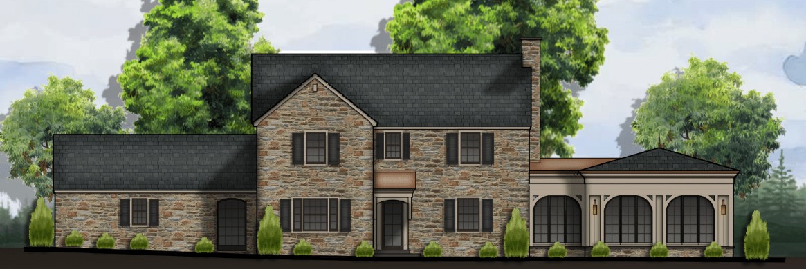 ultra realistic photograph of a traditional stone country house with symmetrical fa ade natural fieldstone masonry with realistic texture variation and brown tones black window and door sashes multi pane windows with subtle reflections dark slate roof with consistent coloring copper roof over front door covered porch with arched windows manicured shrubs and landscaping mature trees in the background soft natural daylight realistic shadows accurate proportions architectural photography dslr photo 35mm lens shallow depth of field global illumination high dynamic range ultra detailed 8k realism true to life materials cinematic yet natural color grading
