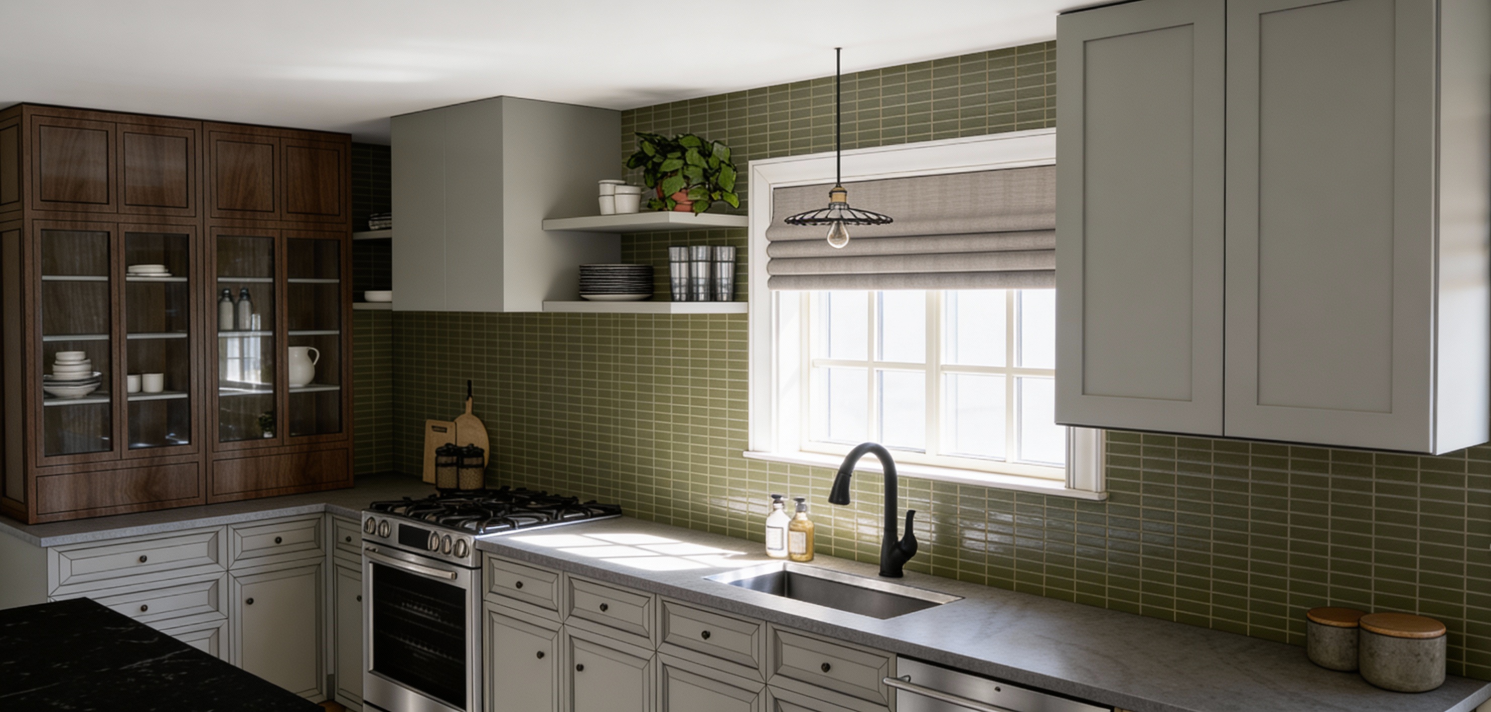 modern farmhouse rustic stone gables vertical wood siding stone tower large glass windows tall grass foreground