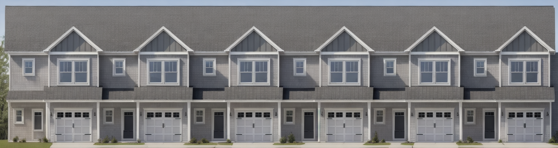 farmhouse style building with white painted brick white siding and dark grey trim dark grey asphalt shingle roofs add a parked car to one of the driveways add a few people daytime rendering with nice shadows