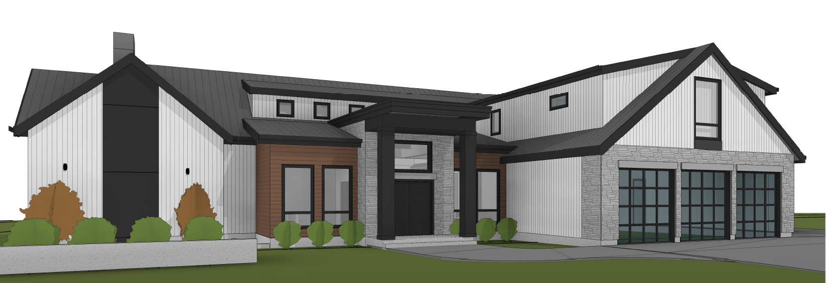 a modern two story house with a dark charcoal gray sloped roof exterior walls feature a mix of textured white stone and sleek dark gray panels the balcony is supported by natural wood oak beams complemented by a glass railing large windows with black frames enhance the contemporary design a lush green lawn full of cedar shrubs and tall grasses surrounds the structure the atmosphere is serene and inviting with soft sunlight casting gentle shadows located in kamloops bc