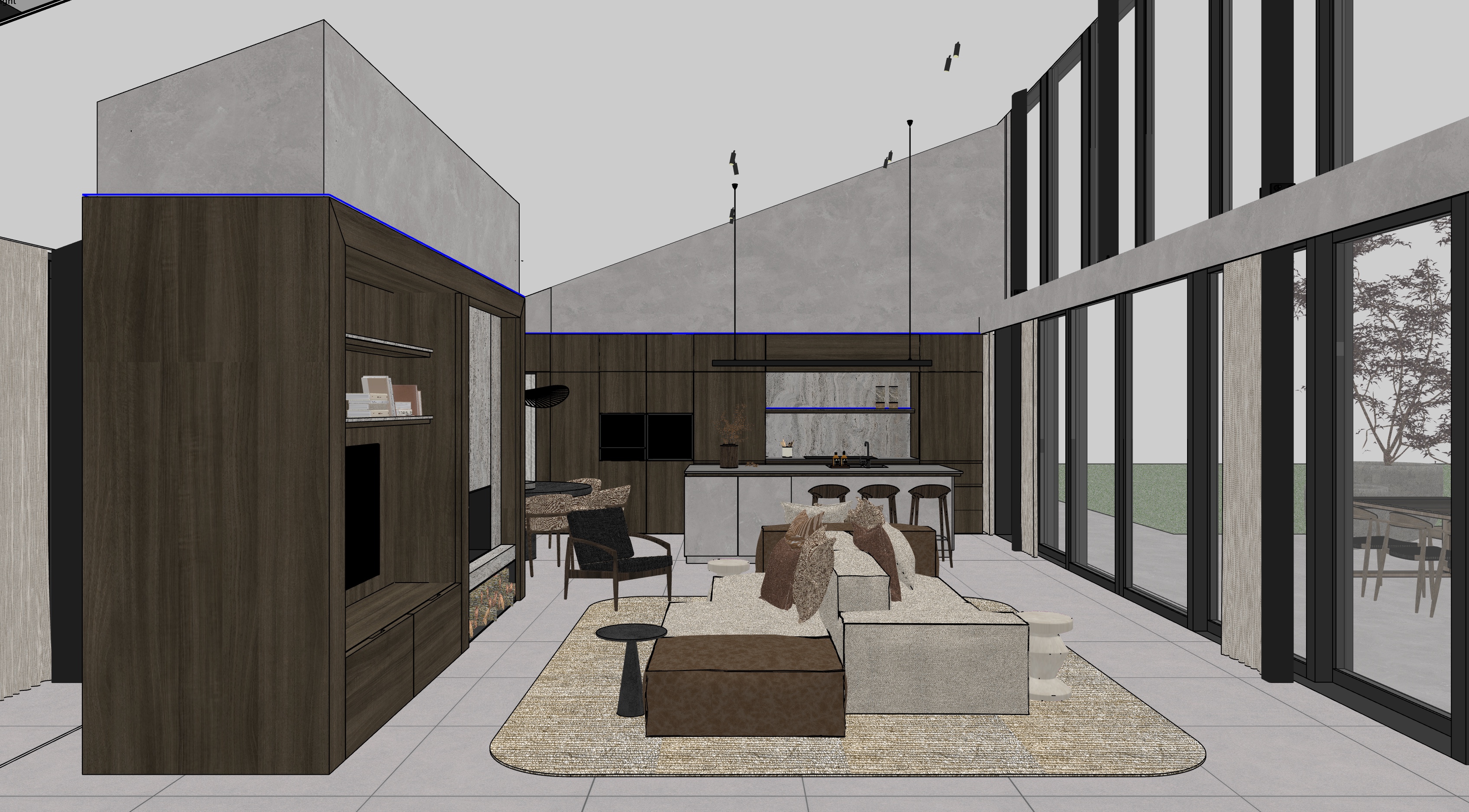 create a high end architectural interior realistic render calm and refined atmosphere soft natural daylight neutral warm palette balanced tones no orange cast diffused light with soft shadows subtle contrast natural color accuracy emphasis on materiality and texture tactile surfaces minimal styling clean architectural lines integrated design serene and timeless space depth and layering cinematic softness slightly desaturated tones photorealistic 35mm lens soft color grading quiet luxury emotional balance breathing space no harsh lighting no strong color cast no oversaturation maintain 100 of the geometry materials colours and layout with a sharp photorealistic result add more natural daylight most important materials concrete stucco grey areas warm grey ceramic tiles 90 x 90 cm open pore travertine titanium carpentry dark oak kitchen countertop inox kitchen island concrete stucco add light in the spots in the ceiling indirect light indicated blue lines replace this by led add some minimalist decoration where necessary not too much ceiling matt white add a great outdoor view garden at the right belgian garden but its a clear day make it look very architectural add the windows on the left side but keep the column